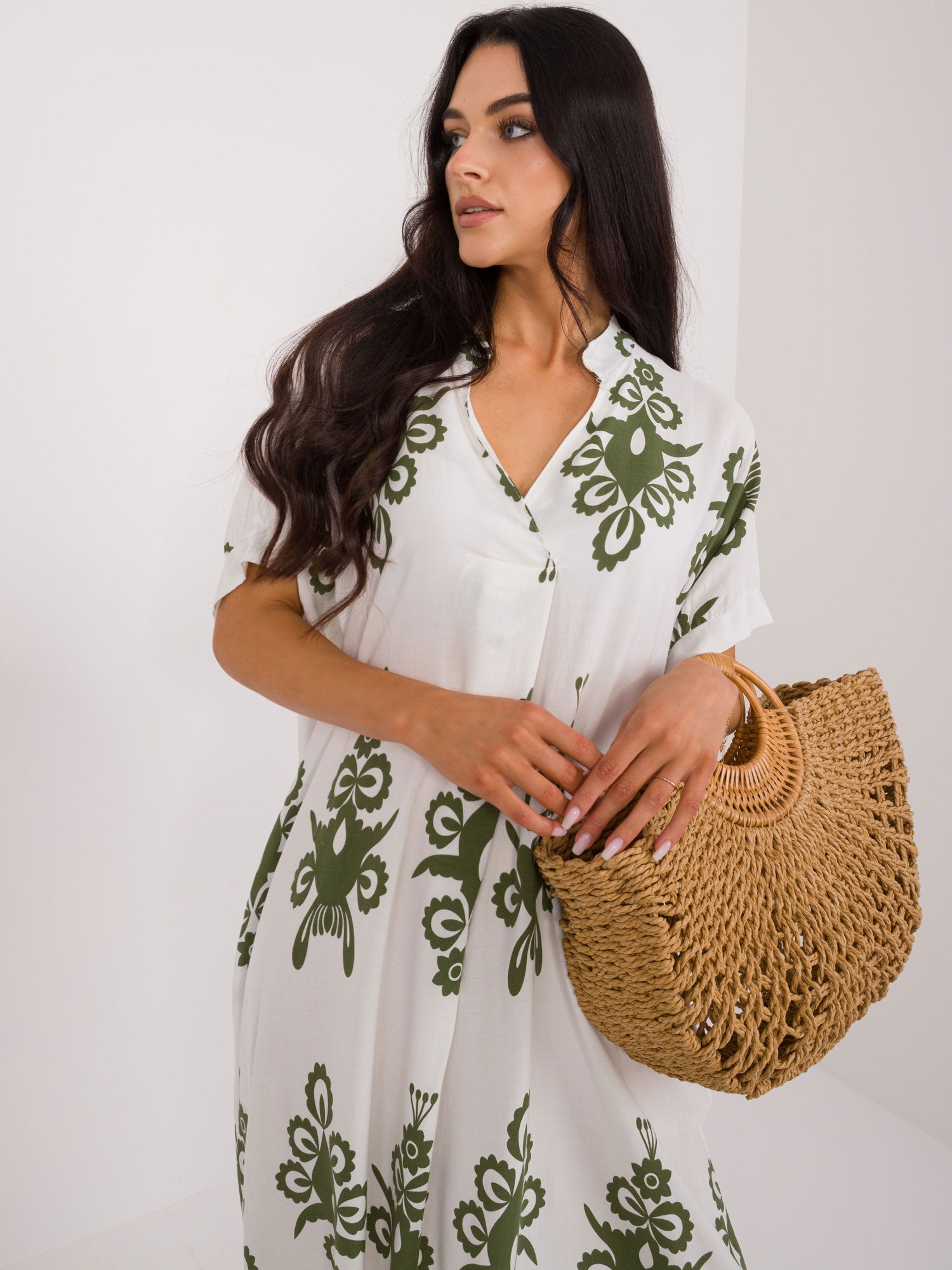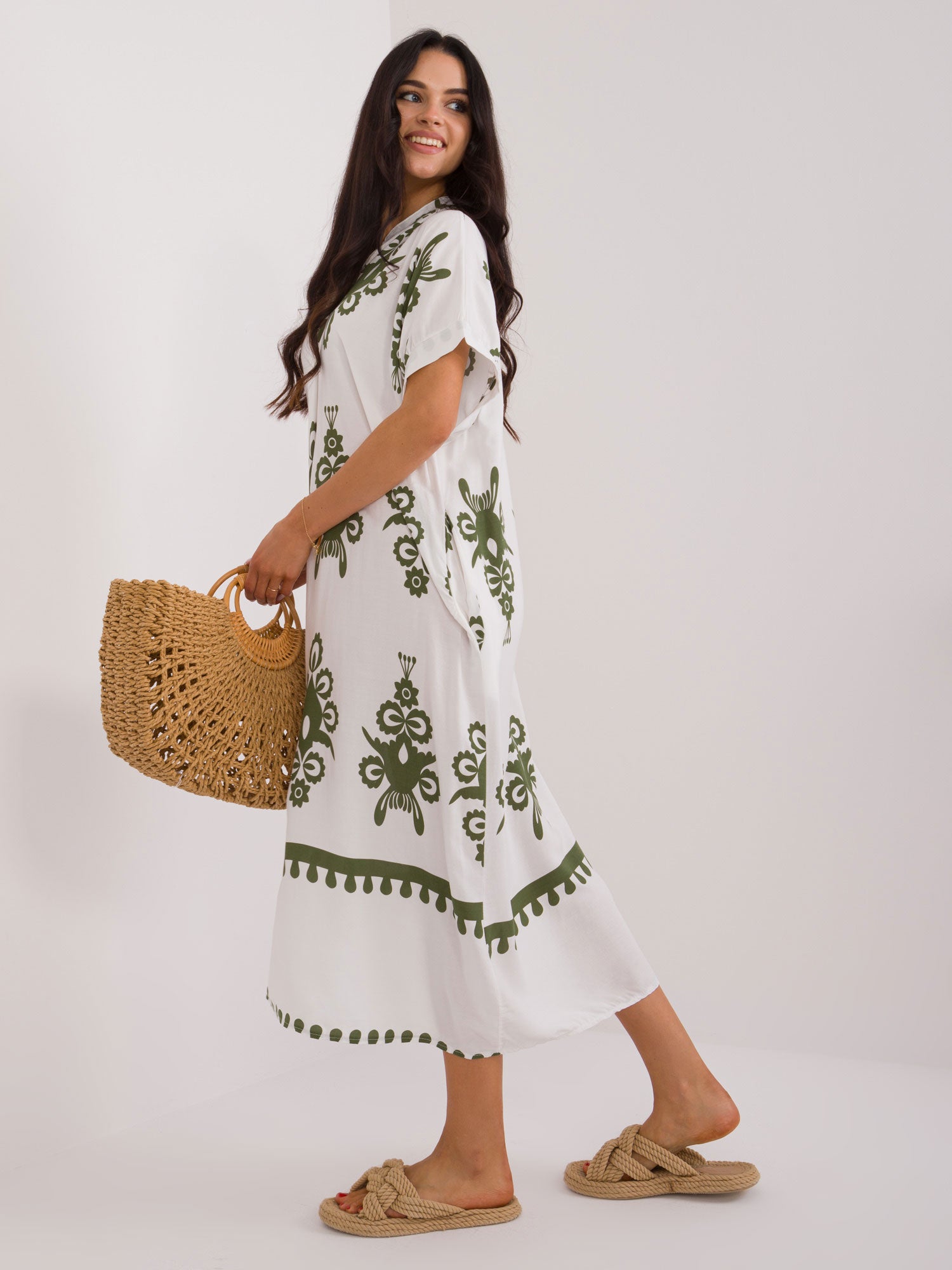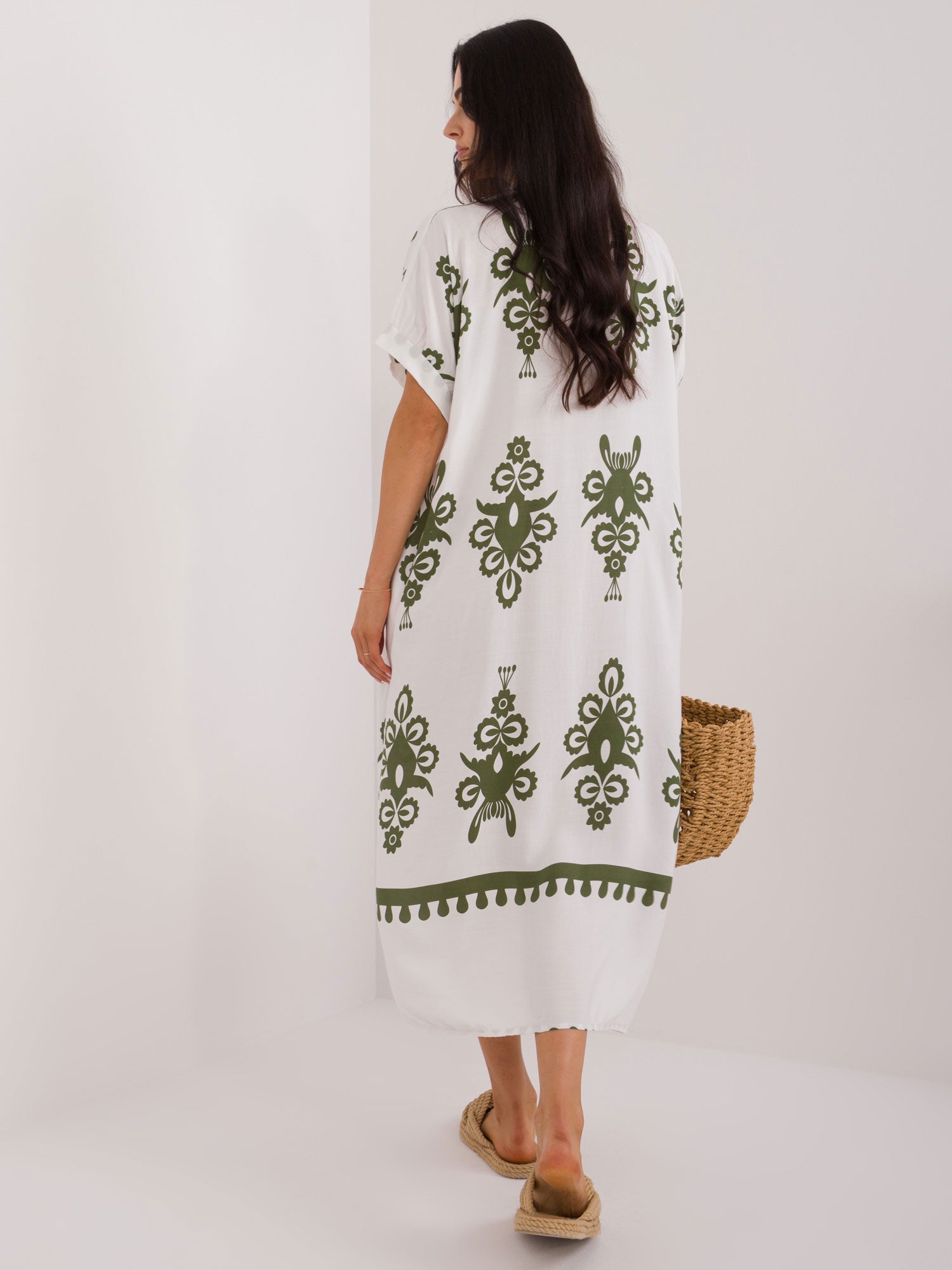 Wymiary sukienki w rozmiarze one size mierzone na płasko: szerokość pod pachami - 65 cm, długość całkowita - 122 cm.