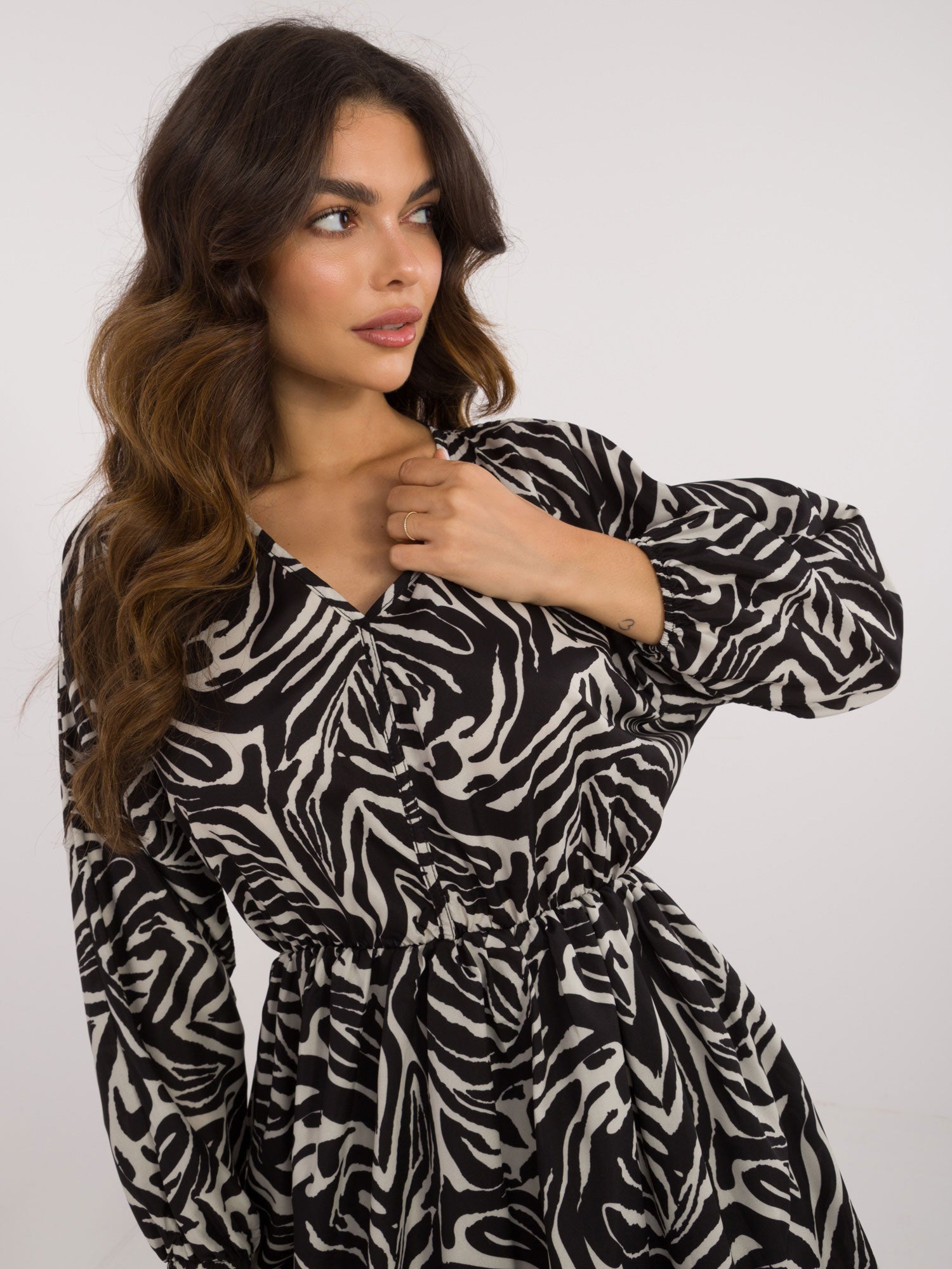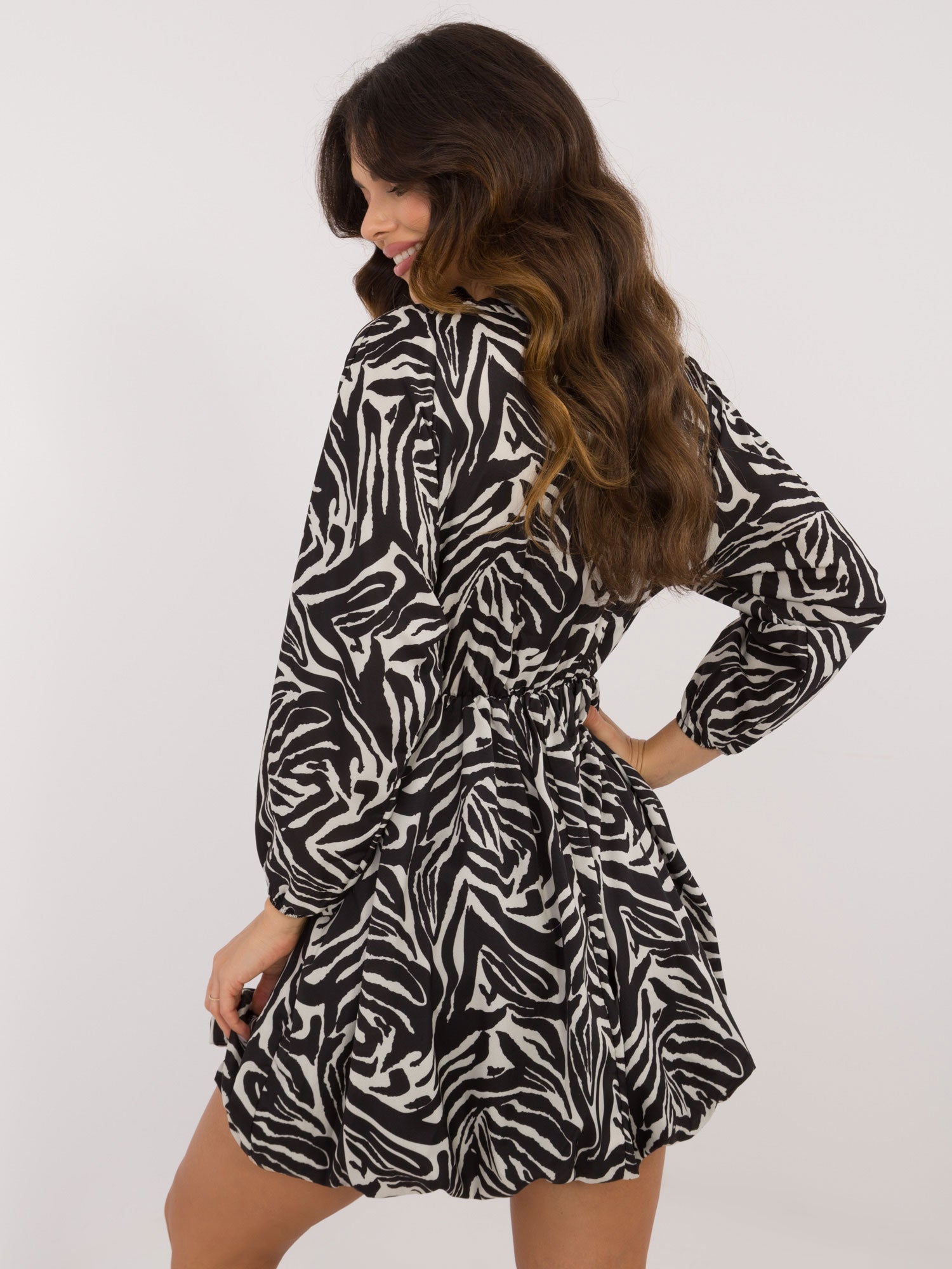 Wymiary sukienki w rozmiarze one size mierzone na płasko: szerokość pod pachami - 60 cm, długość rękawa - 51 cm, długość całkowita - 85 cm.