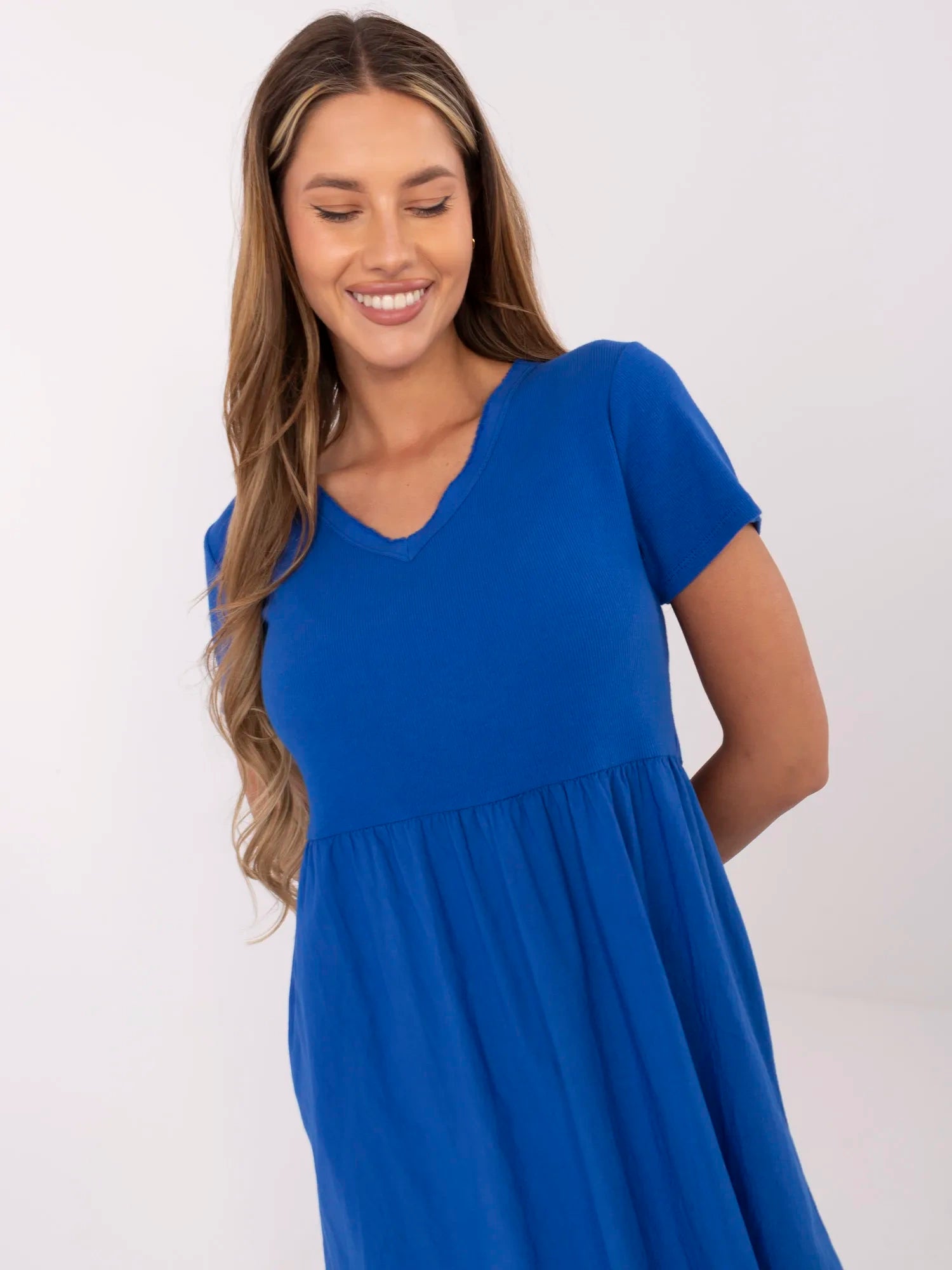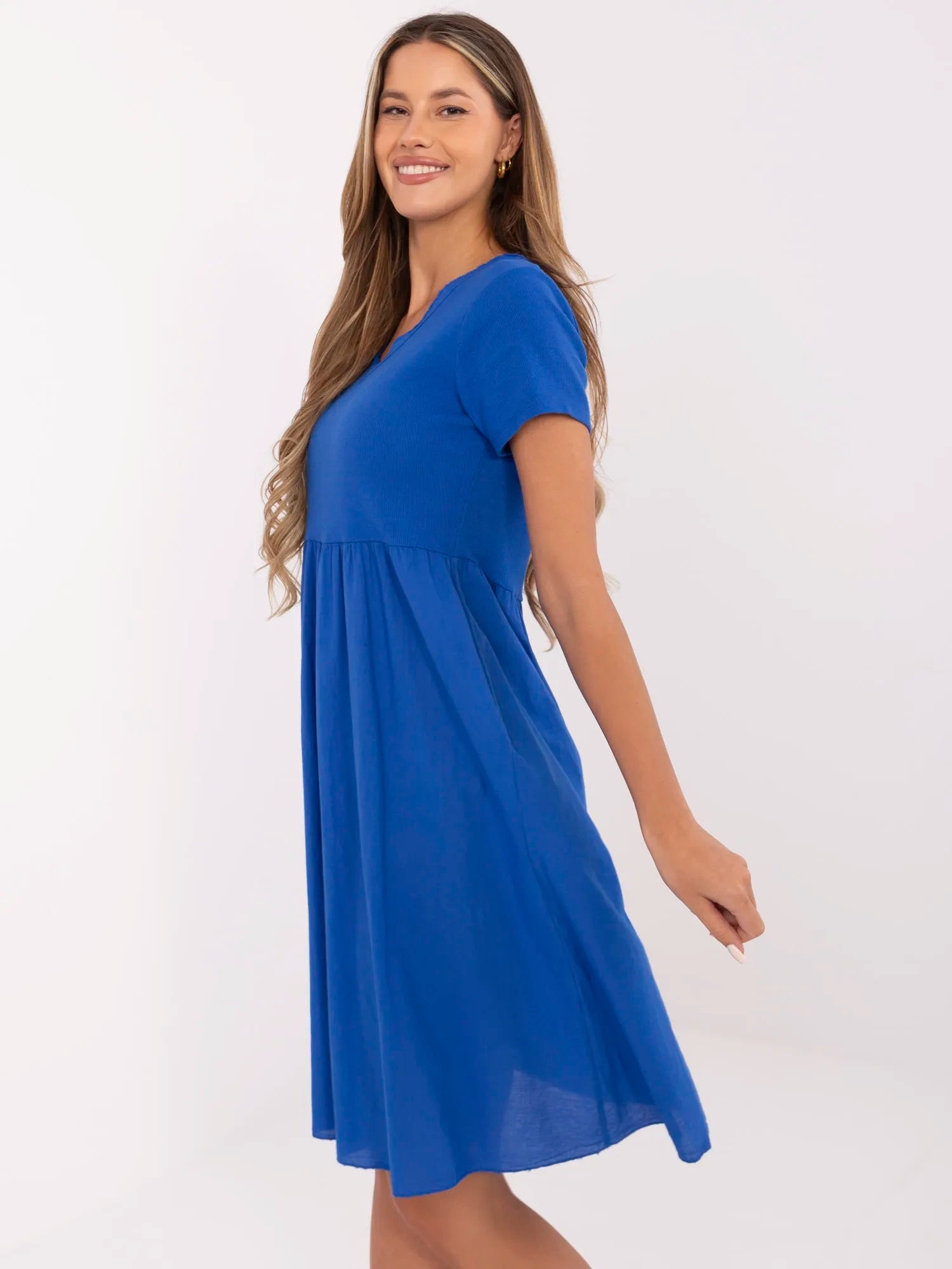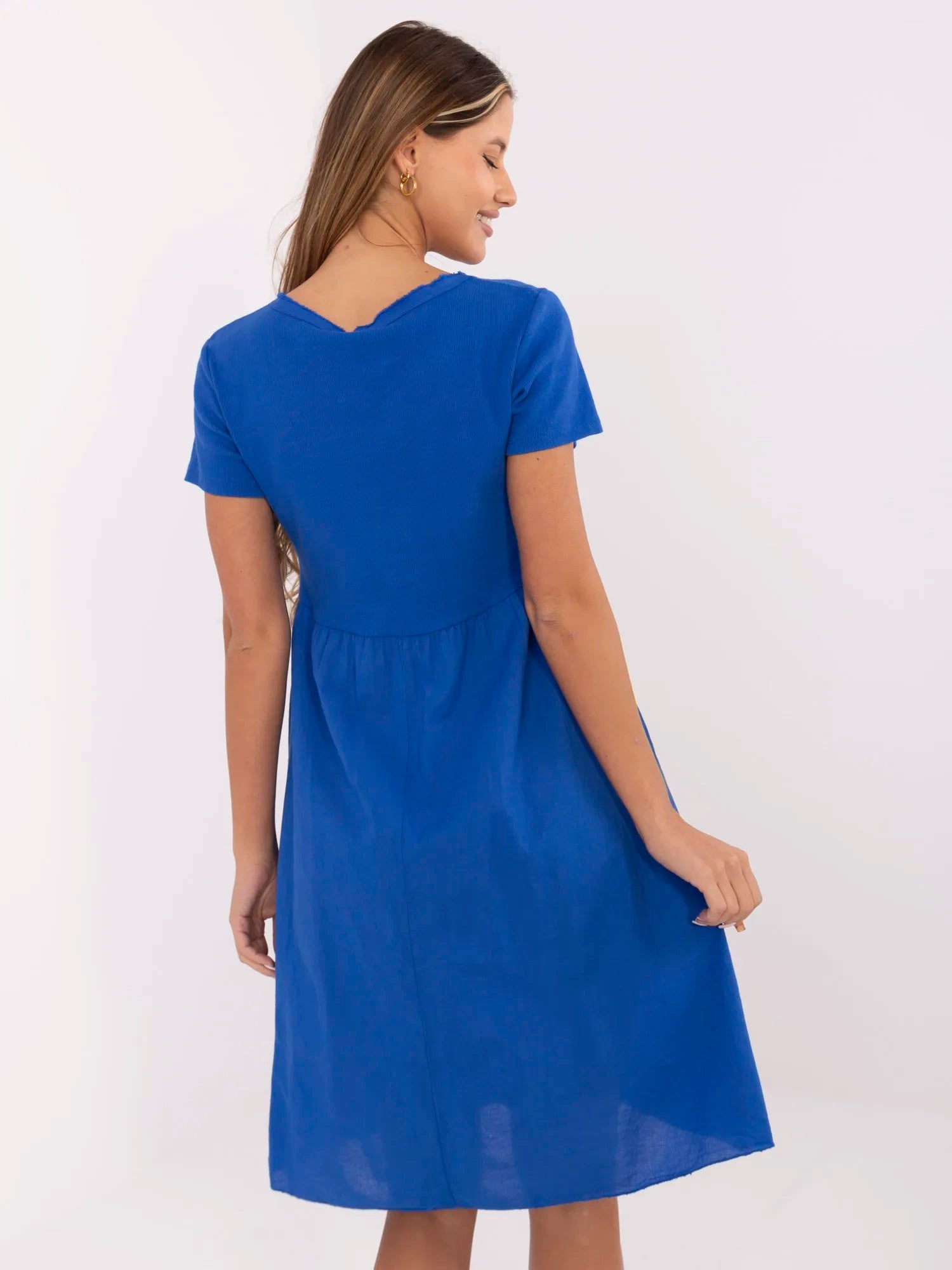 Wymiary sukienki w rozmiarze one size: szerokość pod pachami - 46 cm (na płasko), szerokość pod pachami - 92 cm (po rozciągnięciu), długość rękawa - 17 cm, szerokość w talii - 43 cm (na płasko), szerokość w talii - 67 cm (po rozciągnięciu), szerokość w biodrach - 63 cm, długość całkowita - 103 cm.