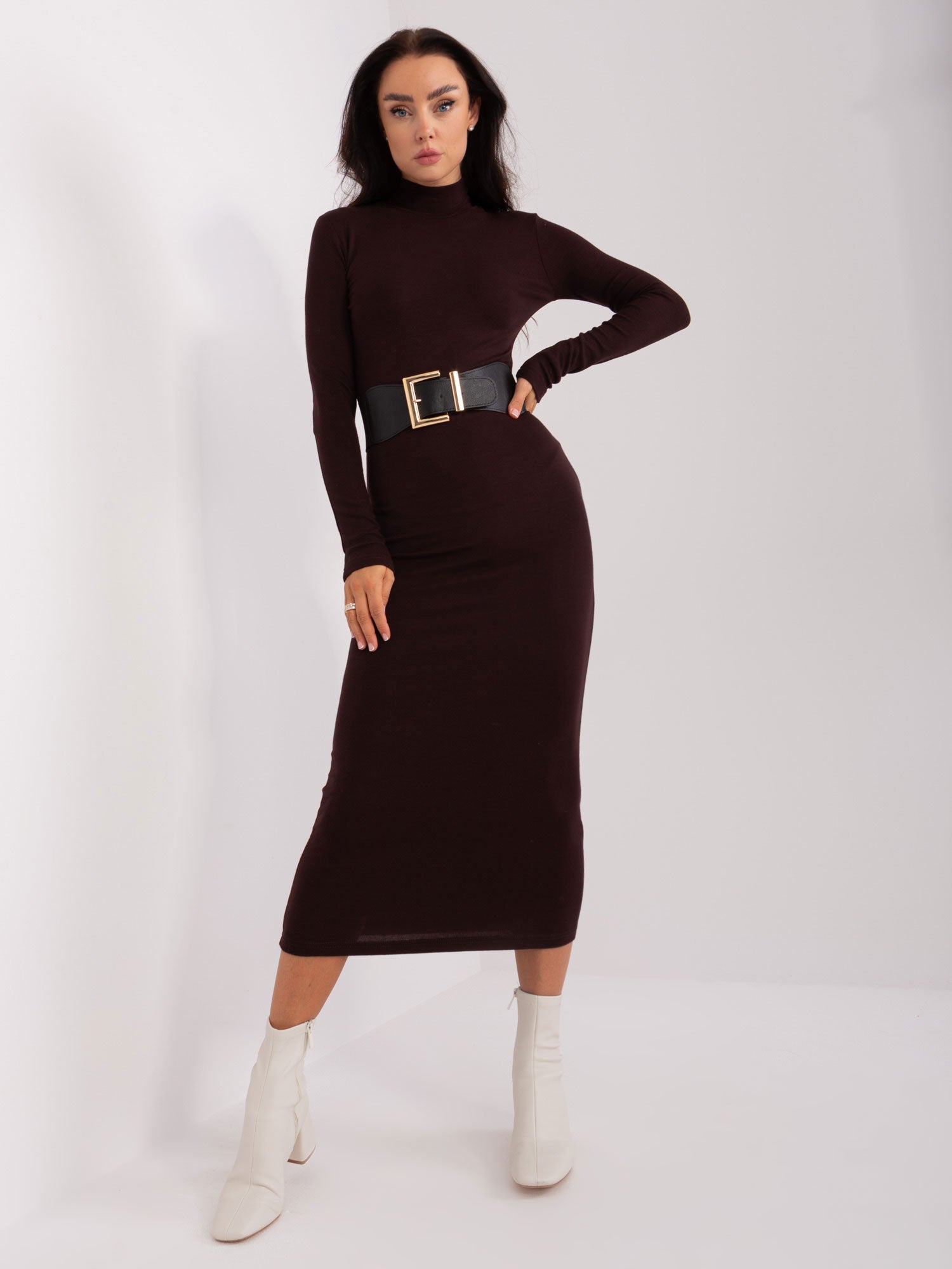 Ciemnobrązowa dopasowana sukienka z paskiem.