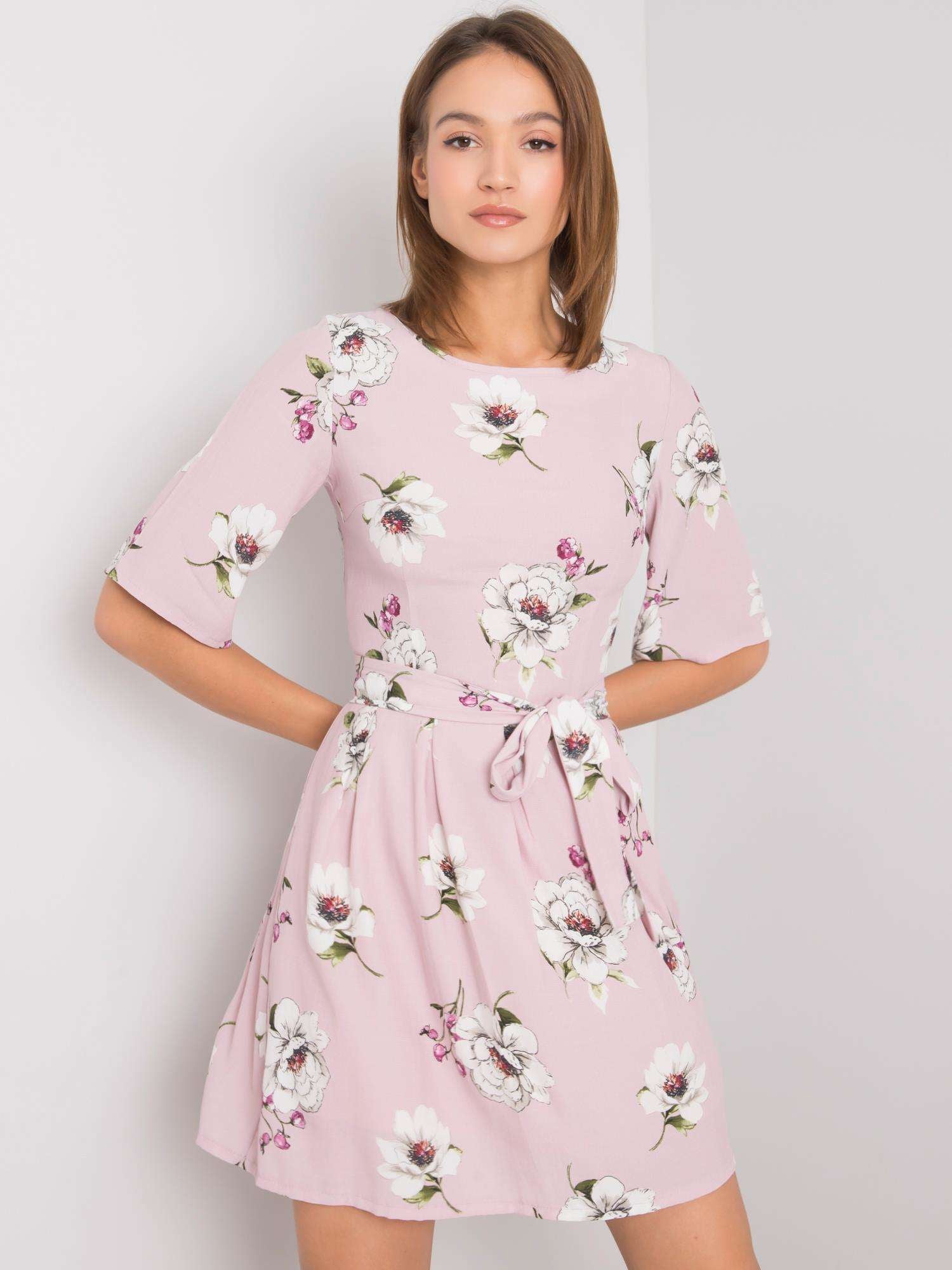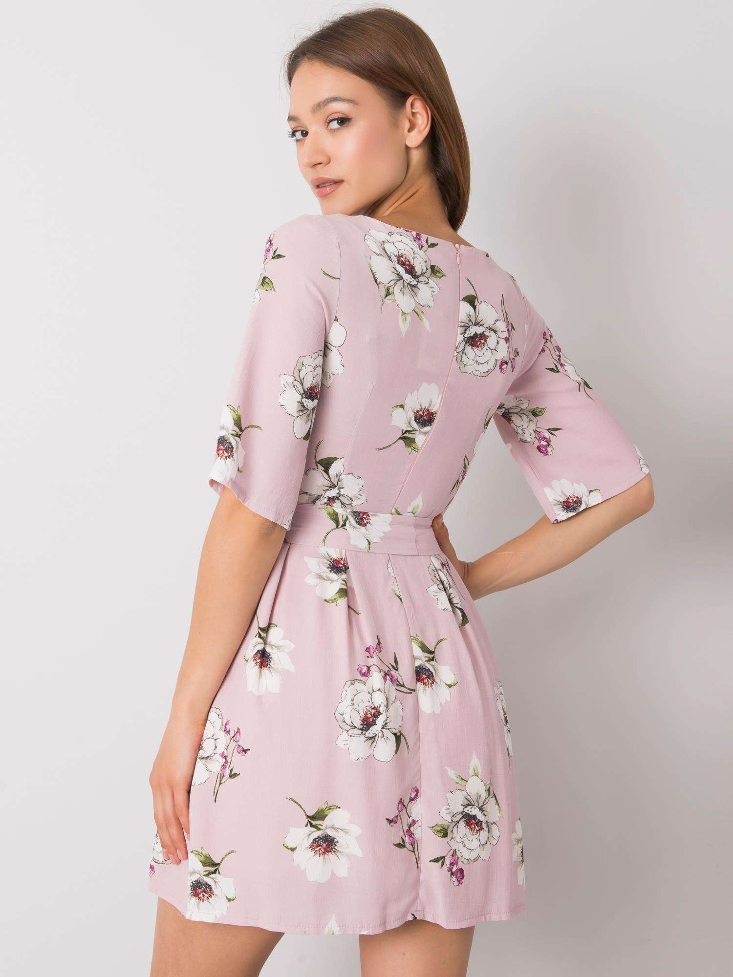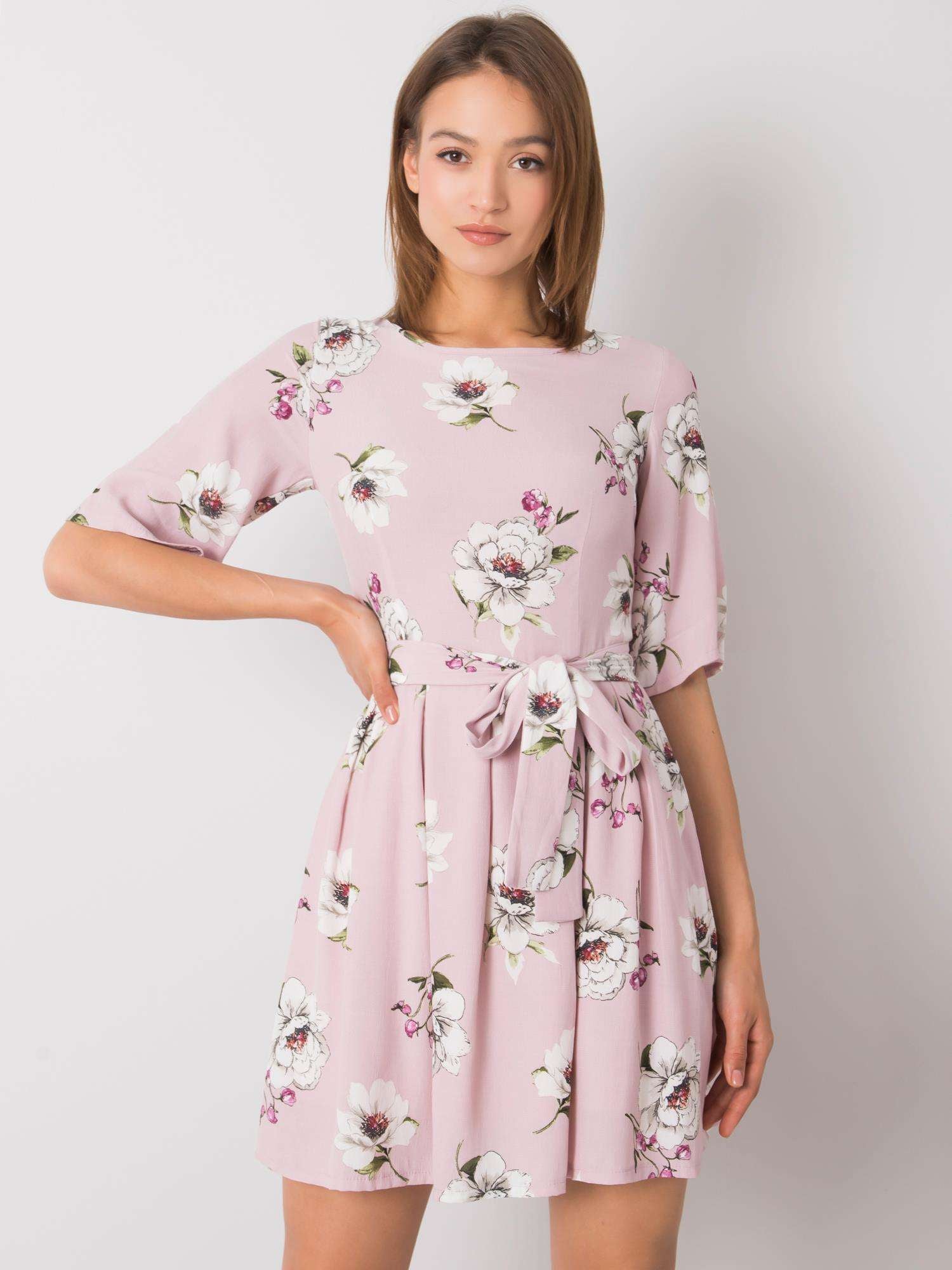 Jasnofioletowa sukienka z kwiatowym nadrukiem.