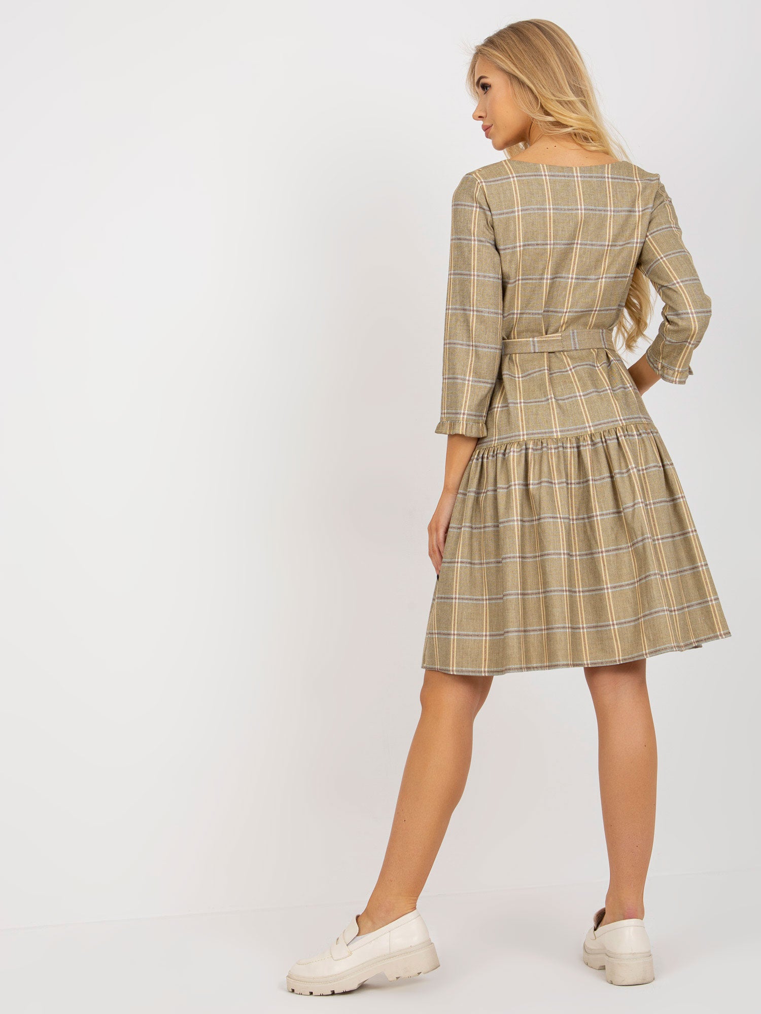 Jasnożółta elegancka sukienka z falbaną w kratę .