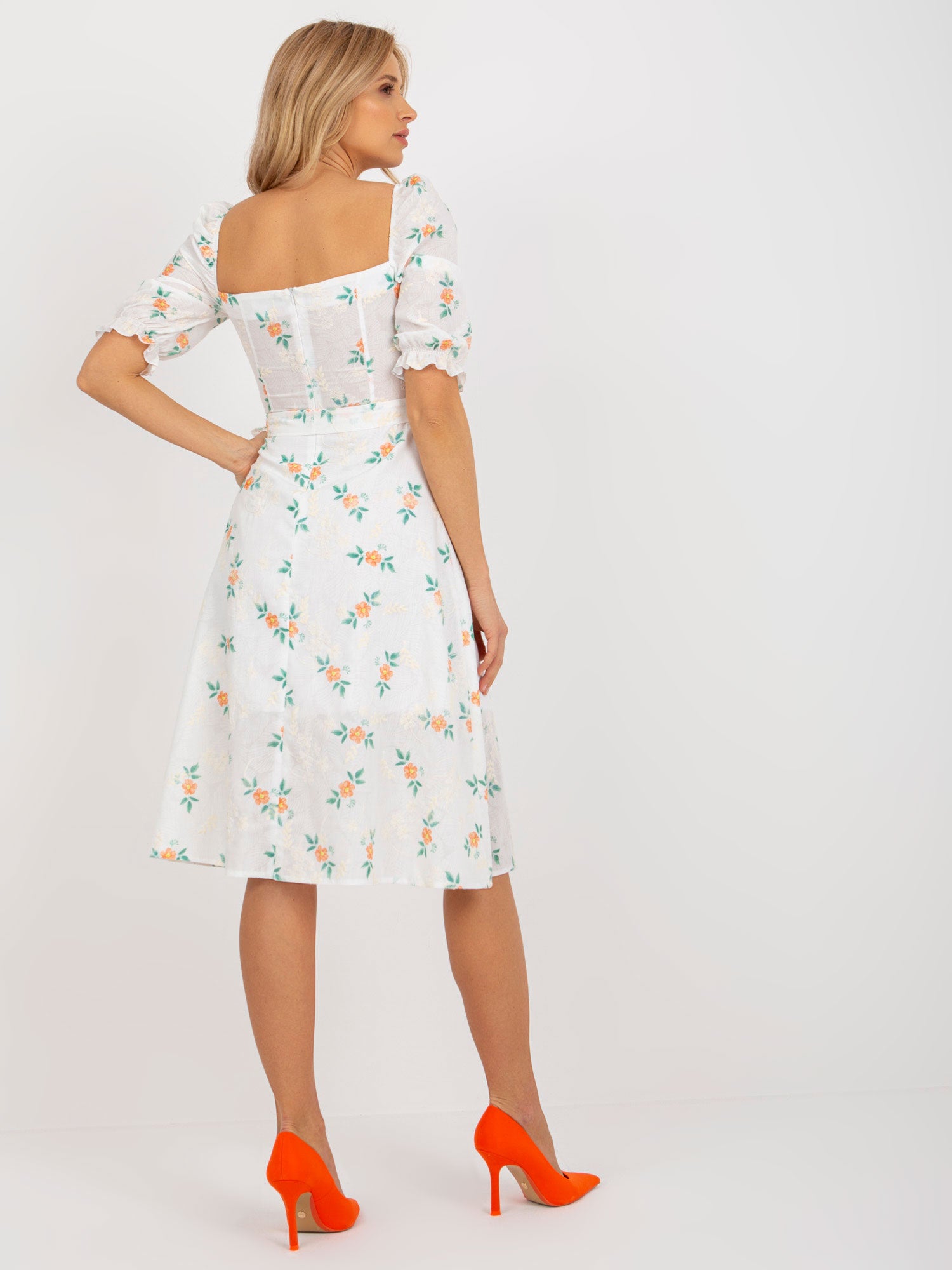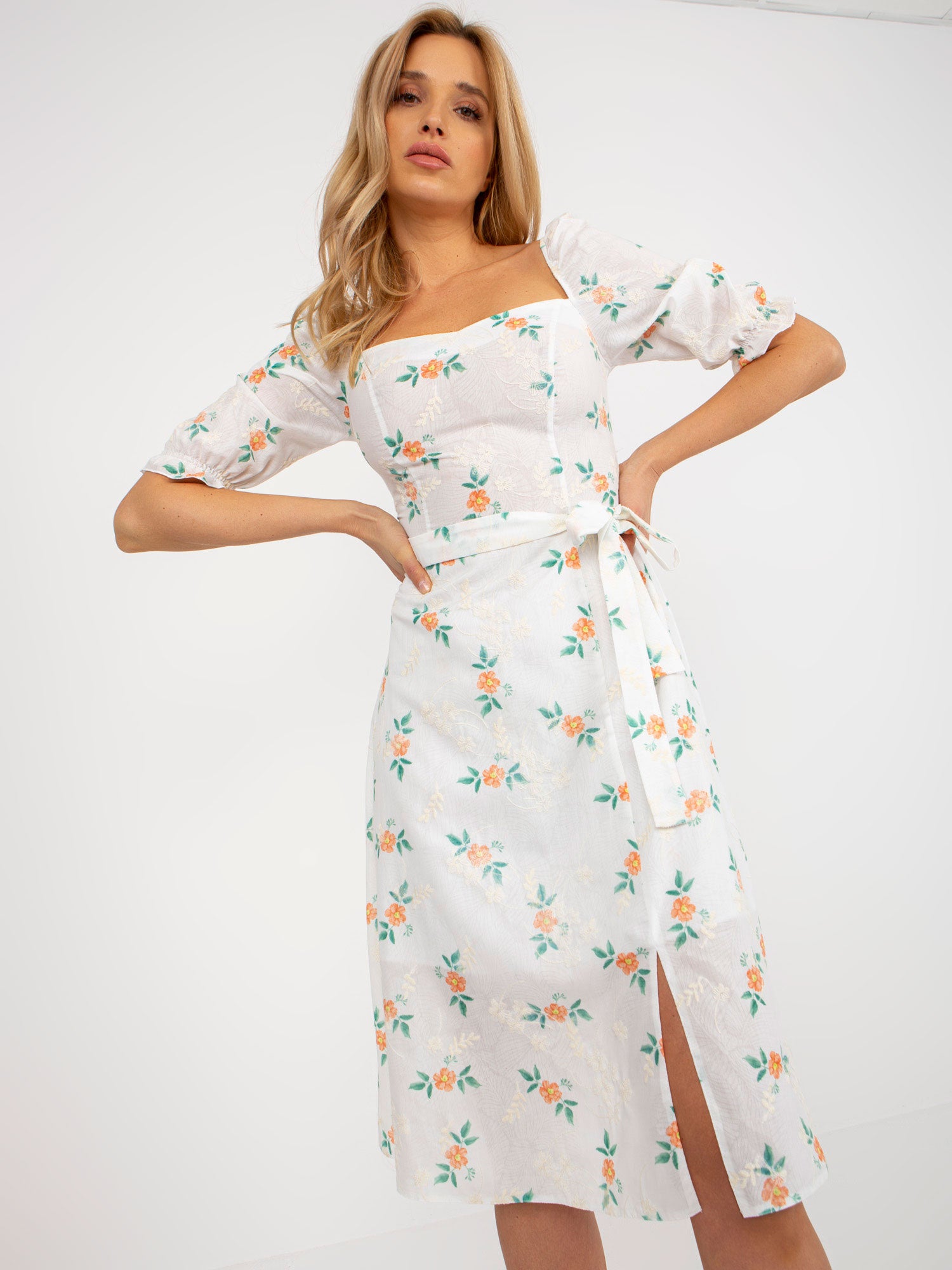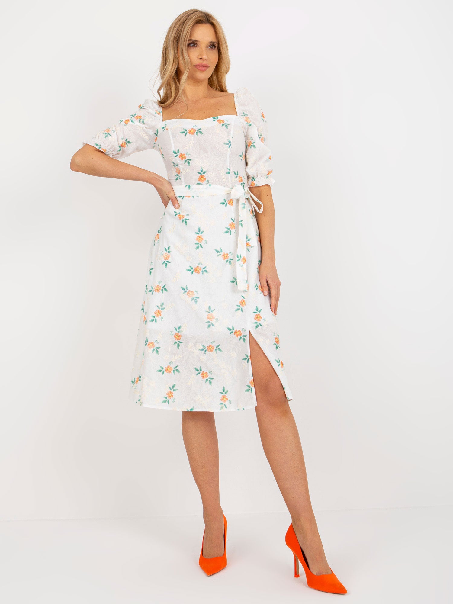 Biało-pomarańczowa midi sukienka w kwiaty z rozcięciem .