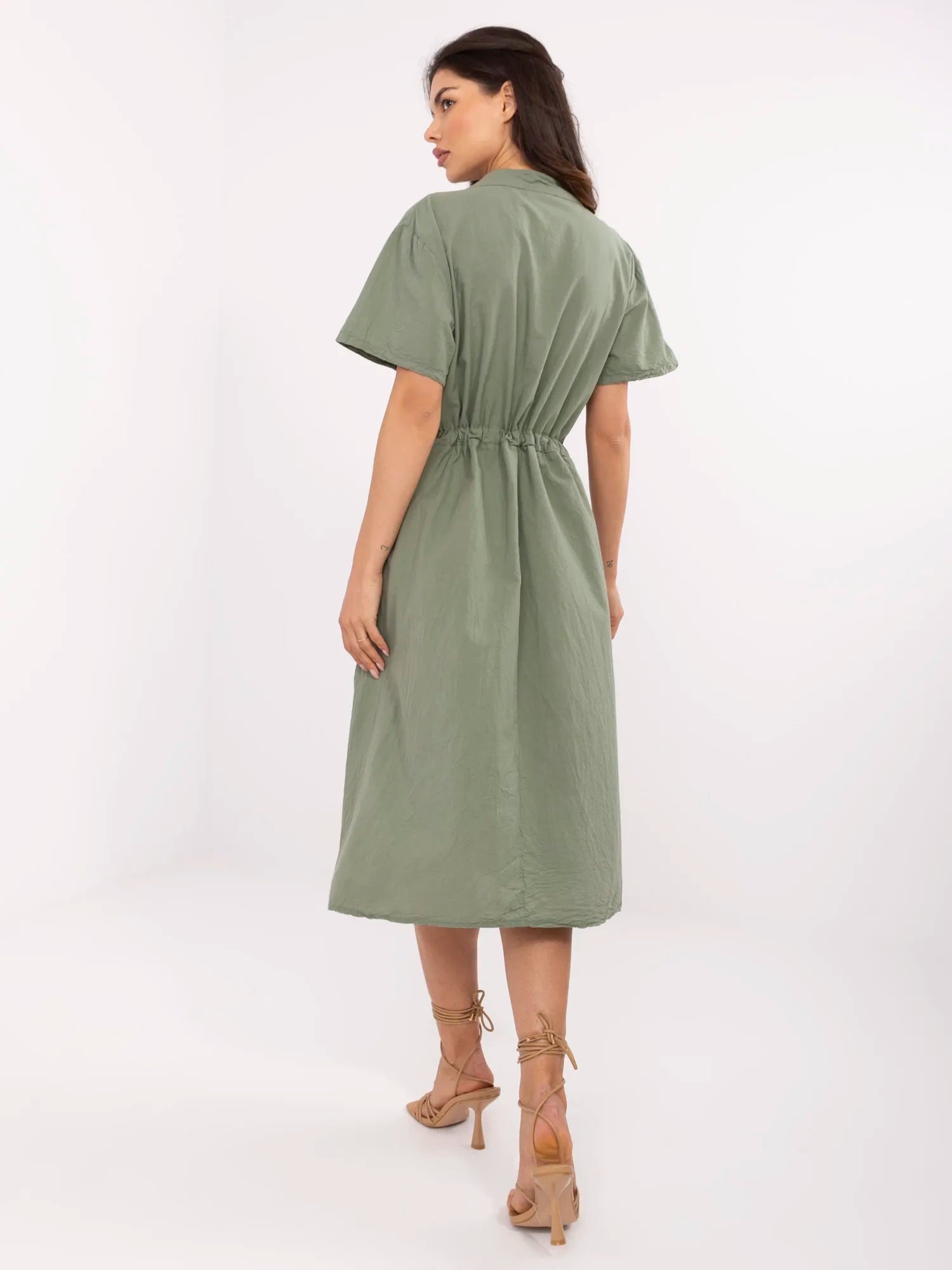 Wymiary sukienka w rozmiarze one size mierzone na płasko: szerokość pod pachami - 58 cm (na płasko), szerokość w talii - 56 cm, szerokość w biodrach - 66 cm, długość rękawa - 19 cm, długość całkowita - 115 cm.
