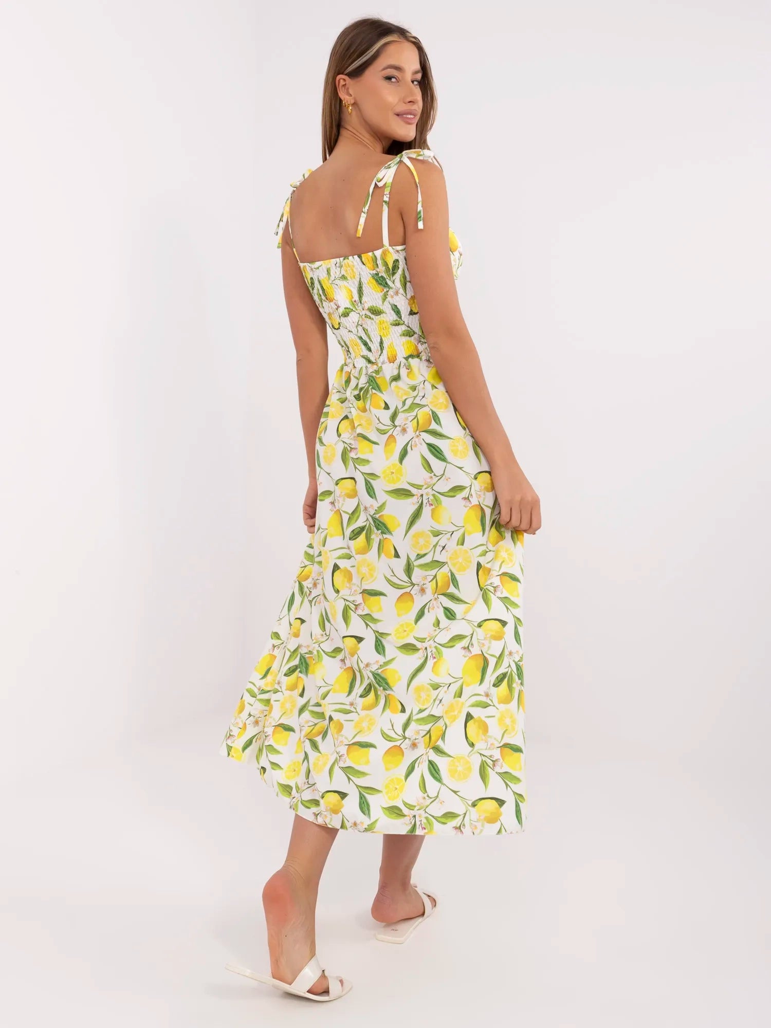 Wymiary sukienki w rozmiarze one size mierzone na płasko: szerokość pod pachami - 38 cm (na płasko), szerokość pod pachami - 52 cm (po rozciągnięciu), szerokość w talii - 34 cm, szerokość w biodrach - 59 cm, długość całkowita - 136 cm.