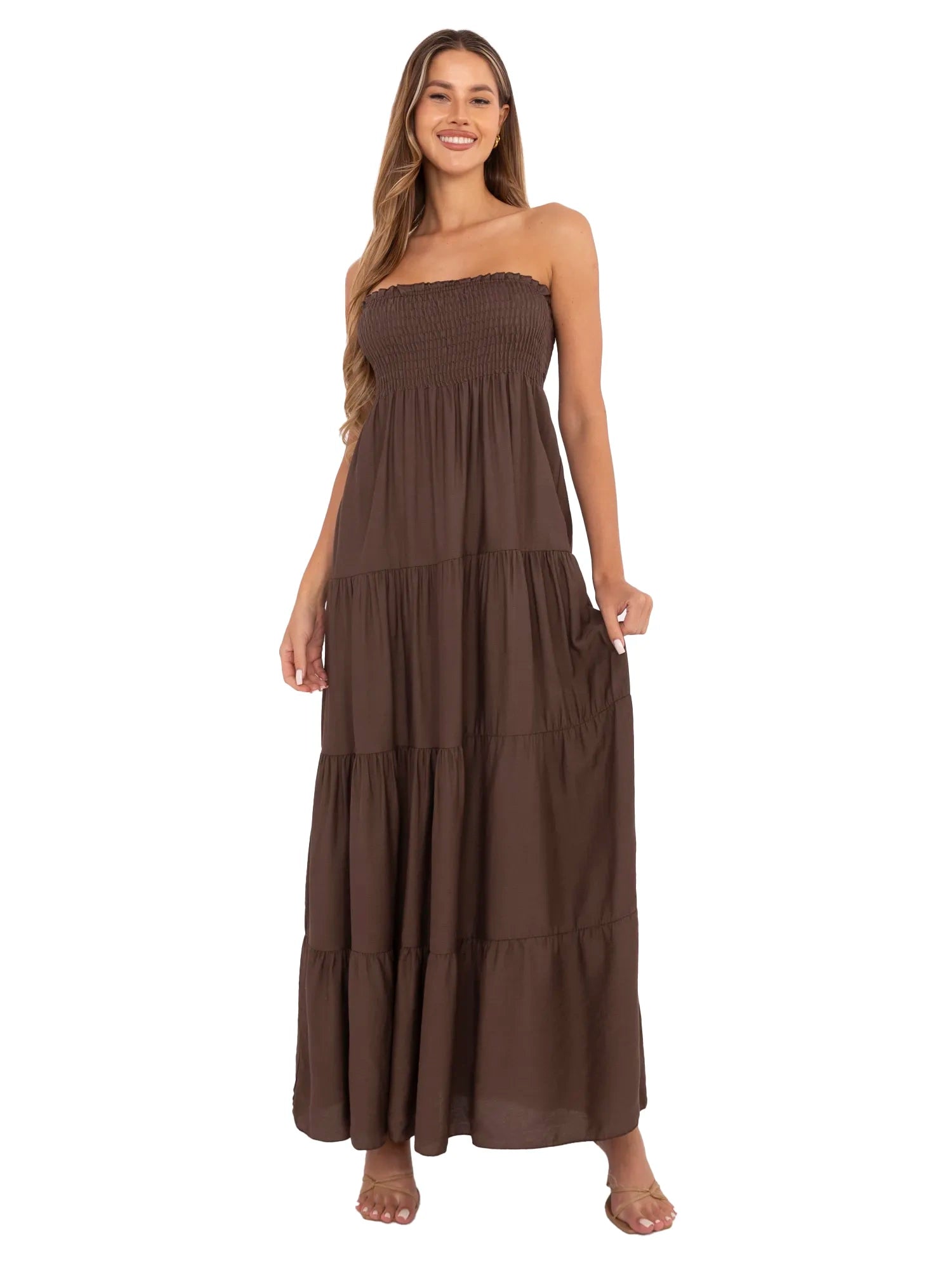 Wymiary sukienki w rozmiarze one size mierzone na płasko: szerokość pod pachami - 32 cm (na płasko), szerokość pod pachami - 62 cm ( po rozciągnięciu), szerokość w talii - 36 cm (na płasko), szerokość w talii - 60 cm ( po rozciągnięciu), szerokość w biodrach - 56 cm, długość całkowita - 128 cm.