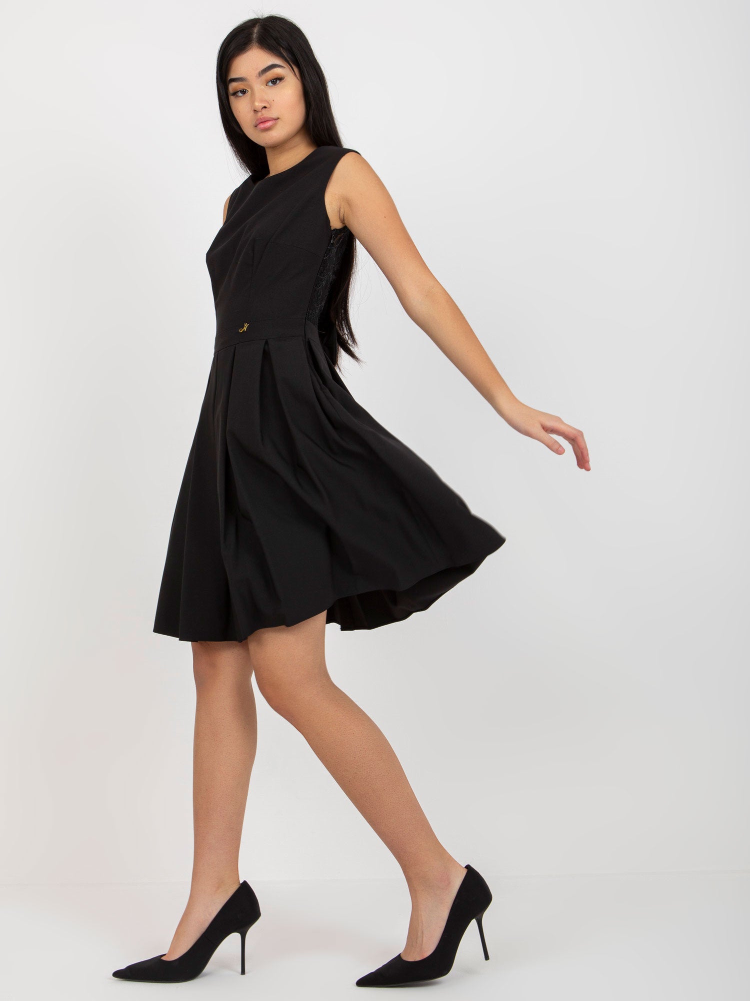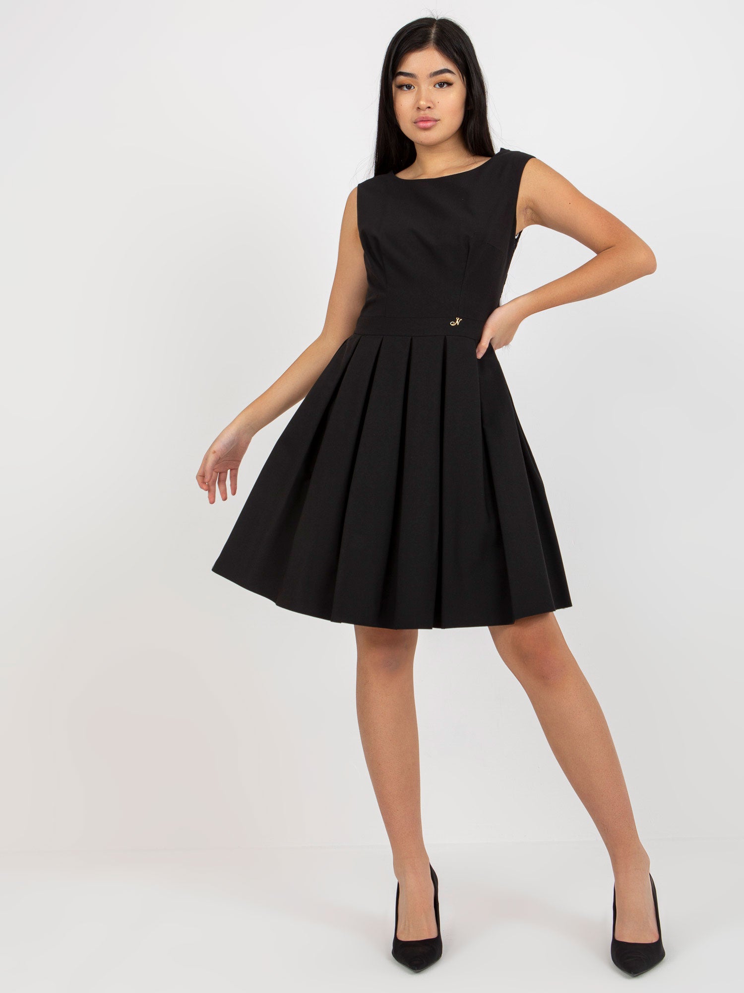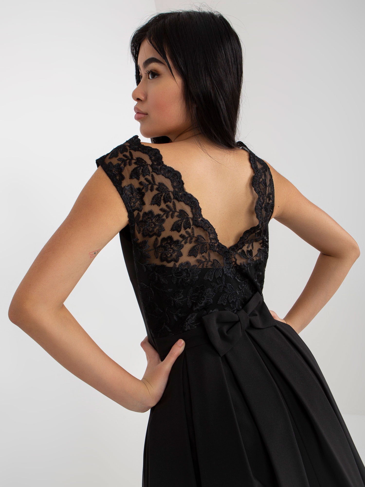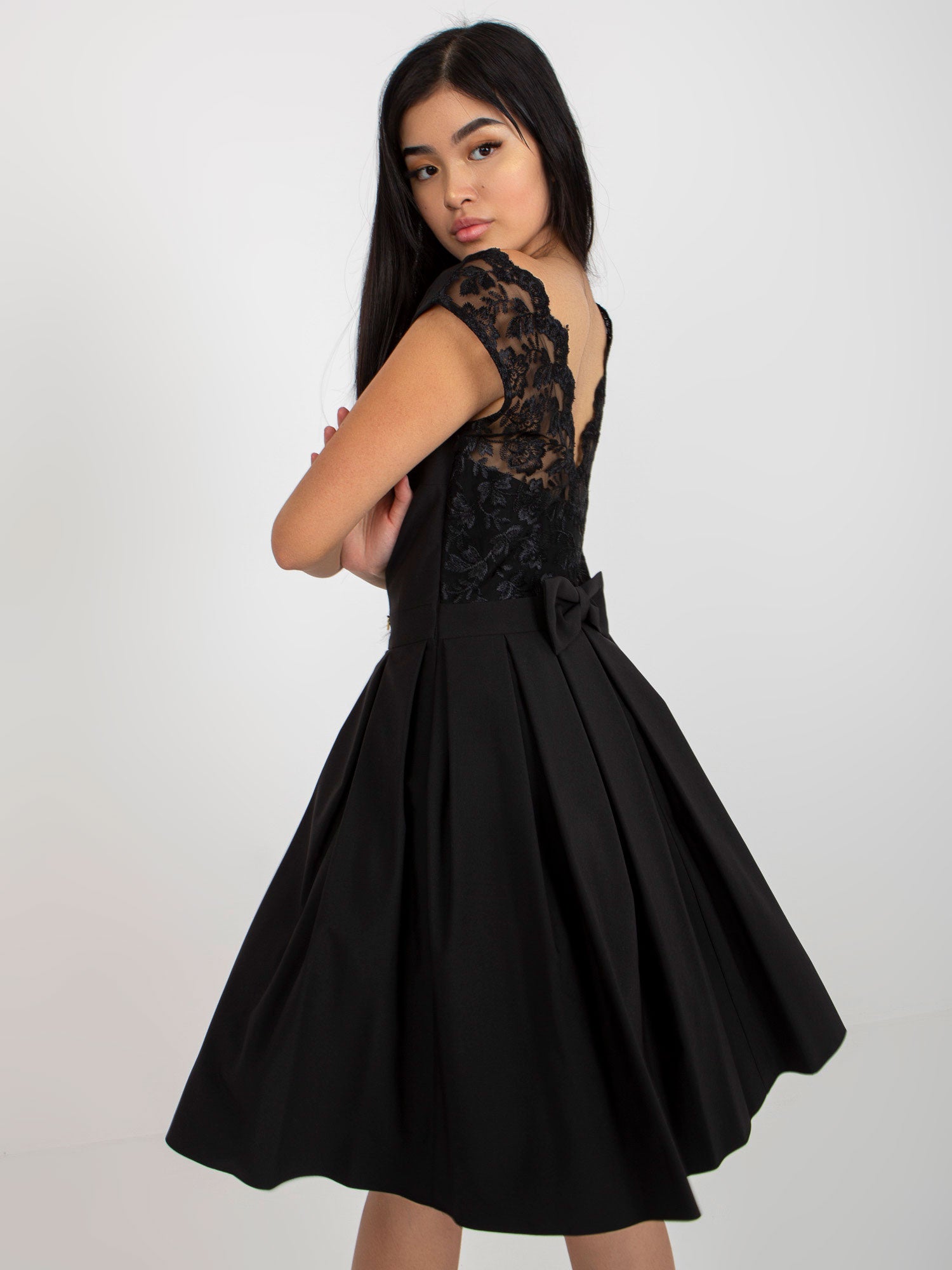 Czarna rozkloszowana sukienka koktajlowa z kokardą .