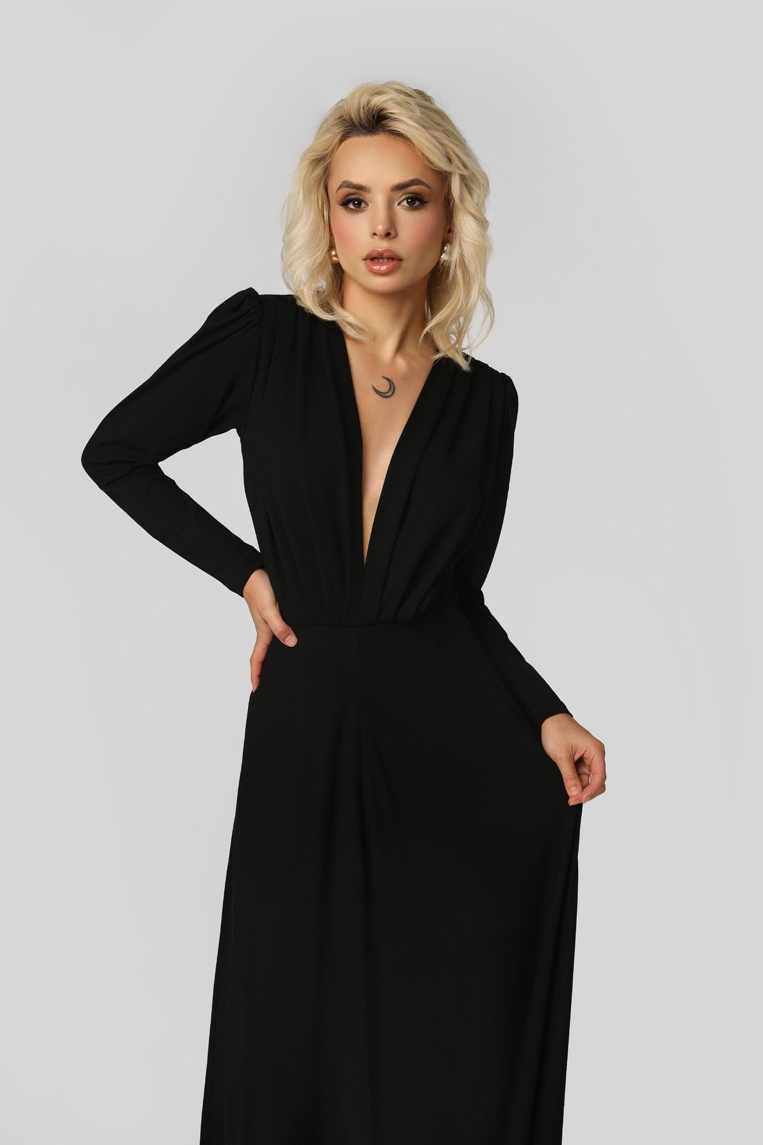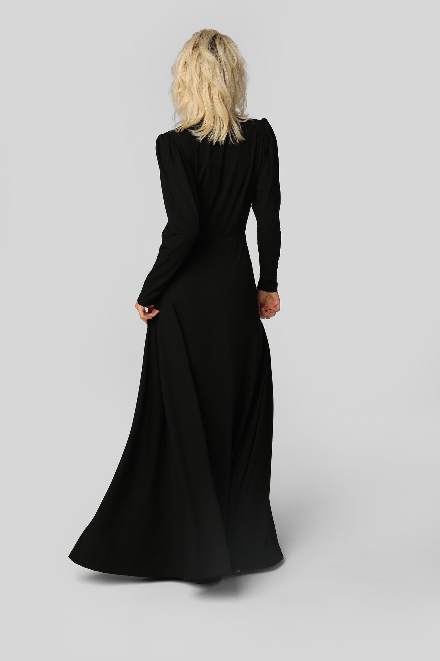 Sukienka o długości maxi z rozkloszowanym dołem w kształcie litery A z rozcięciem na środku. Dekolt jest regulowany haftką, którą możesz zapiąć gdy potrzebujesz zmniejszyć dekolt. Bufiaste rękawy w stylu lat 70’ są dodatkowo podkreślone wkładami barkowymi.