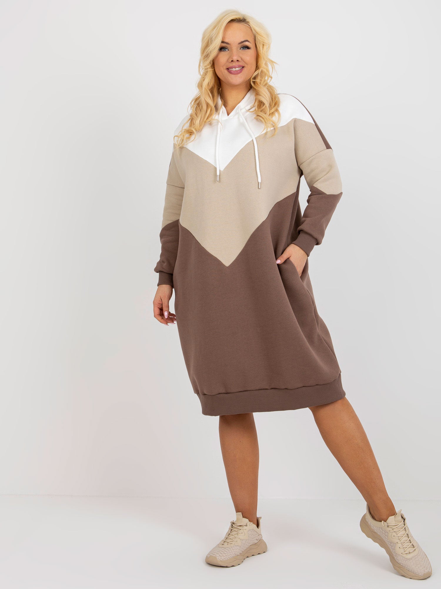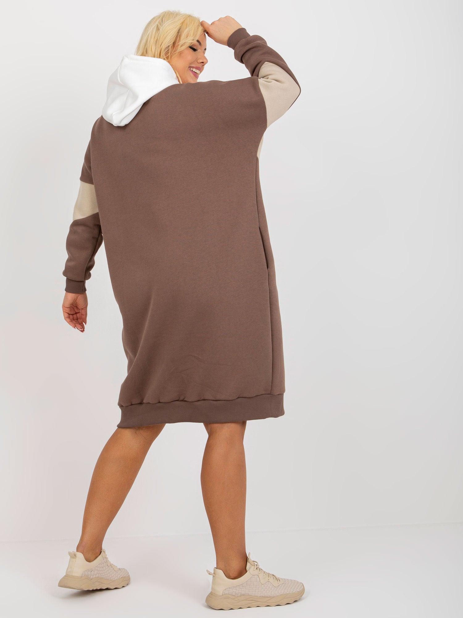 Ecru-brązowa dresowa sukienka plus size basic z kieszeniami .