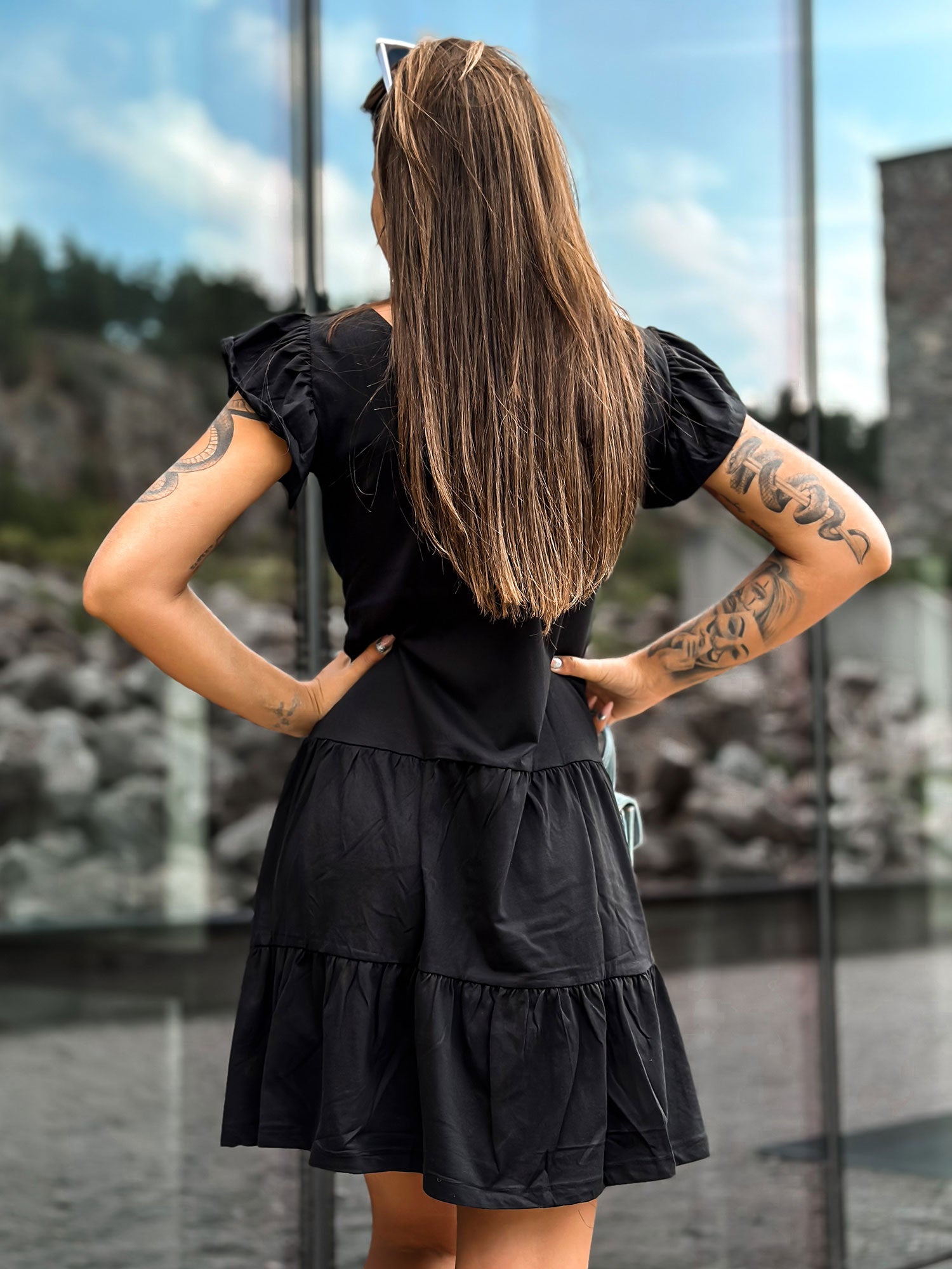 Czarna sukienka z falbaną i trójkątnym dekoltem MAYFLIES.