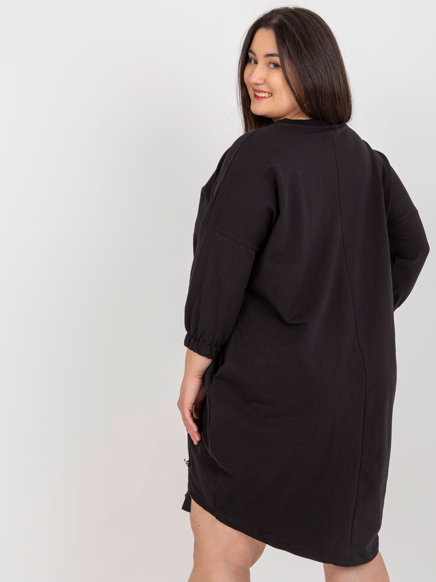 Wymiary sukienki w rozmiarze one size mierzone na płasko: szerokość pod pachami - 68 cm, długość rękawa - 45 cm, długość całkowita (przód) - 83 cm, długość całkowita (tył) - 94 cm .