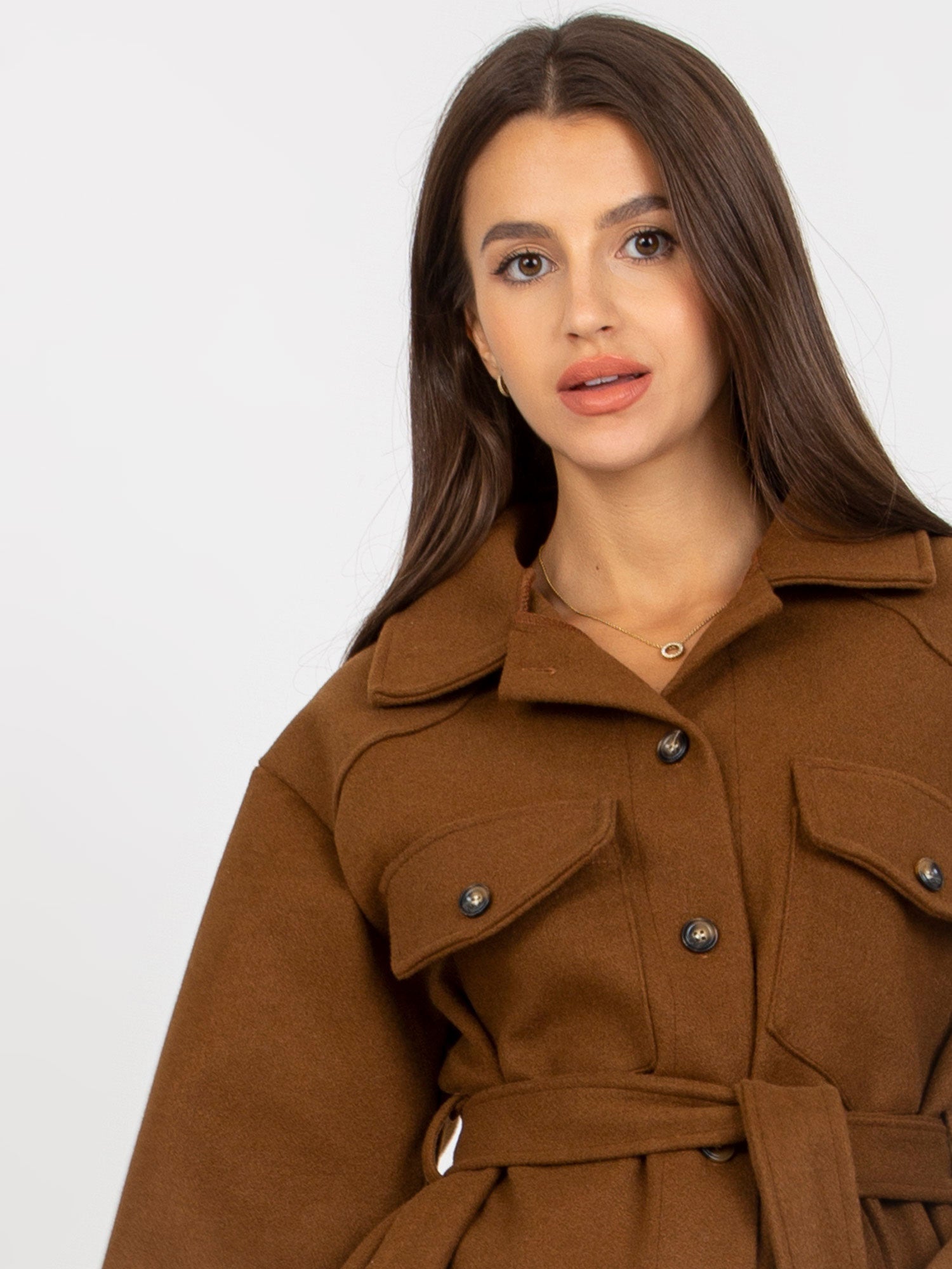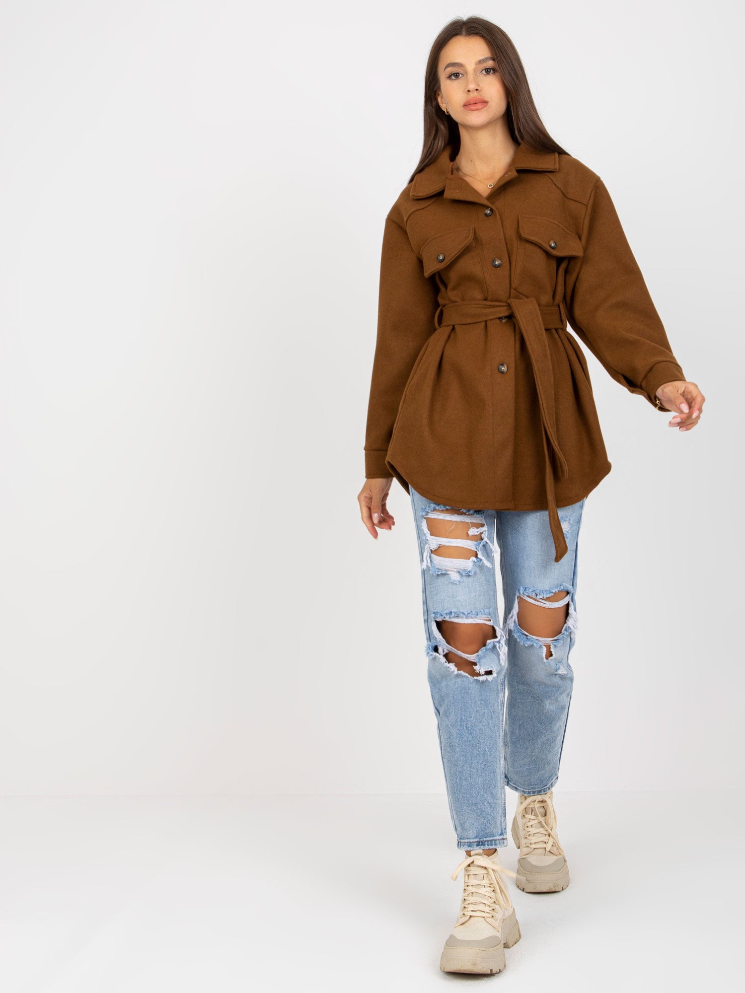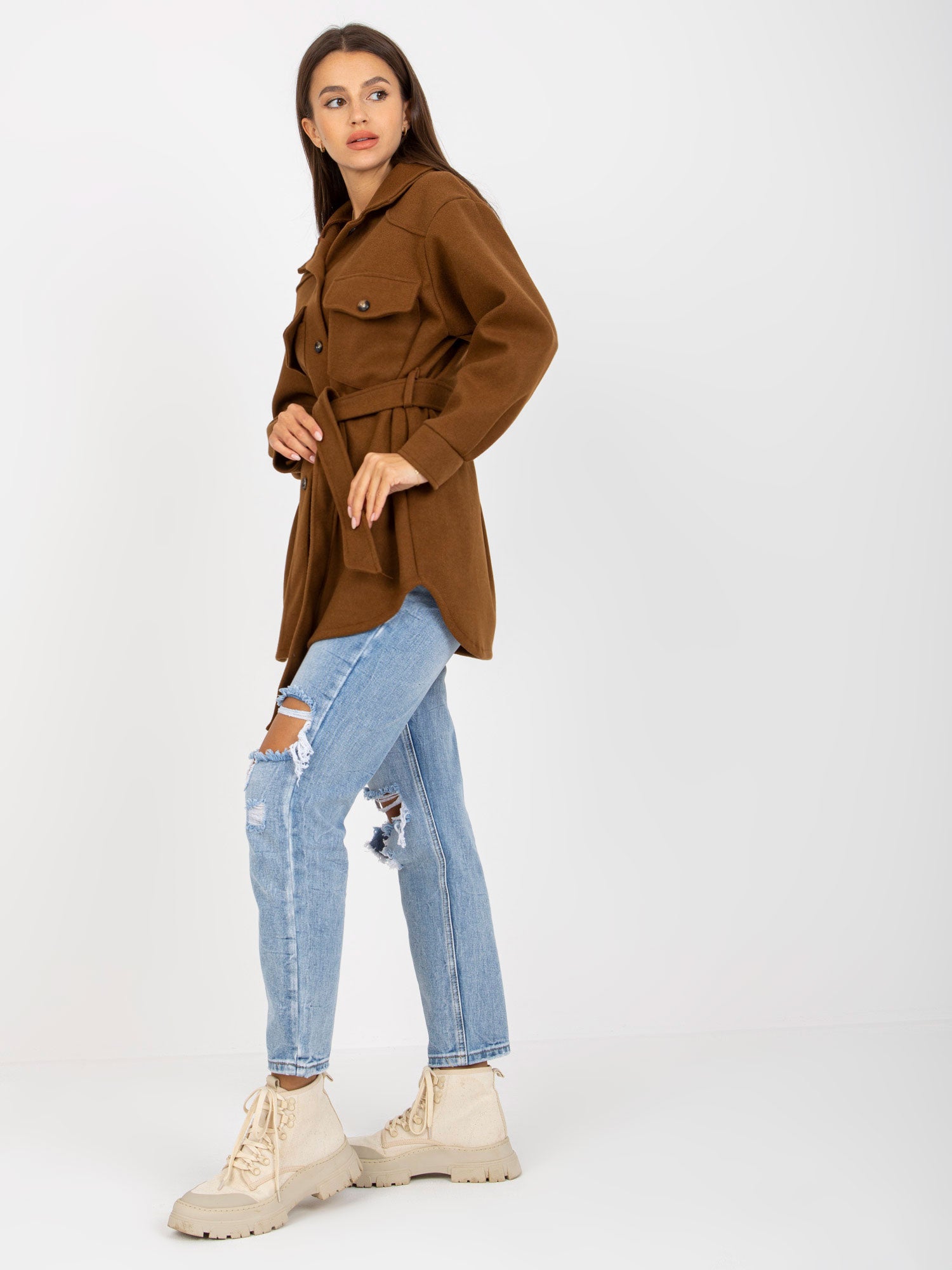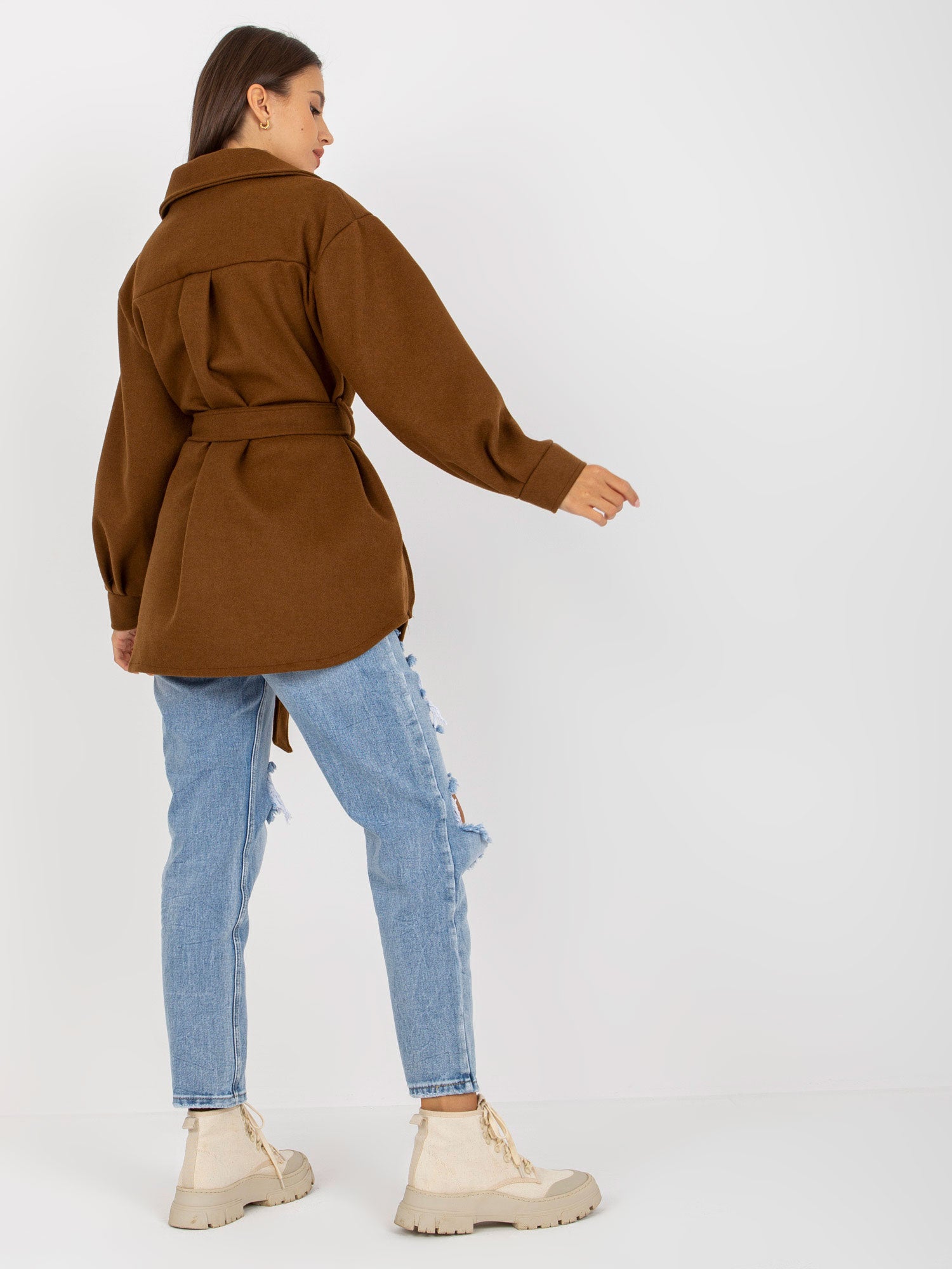 Brązowa damska koszula z kieszeniami i wiązaniem.