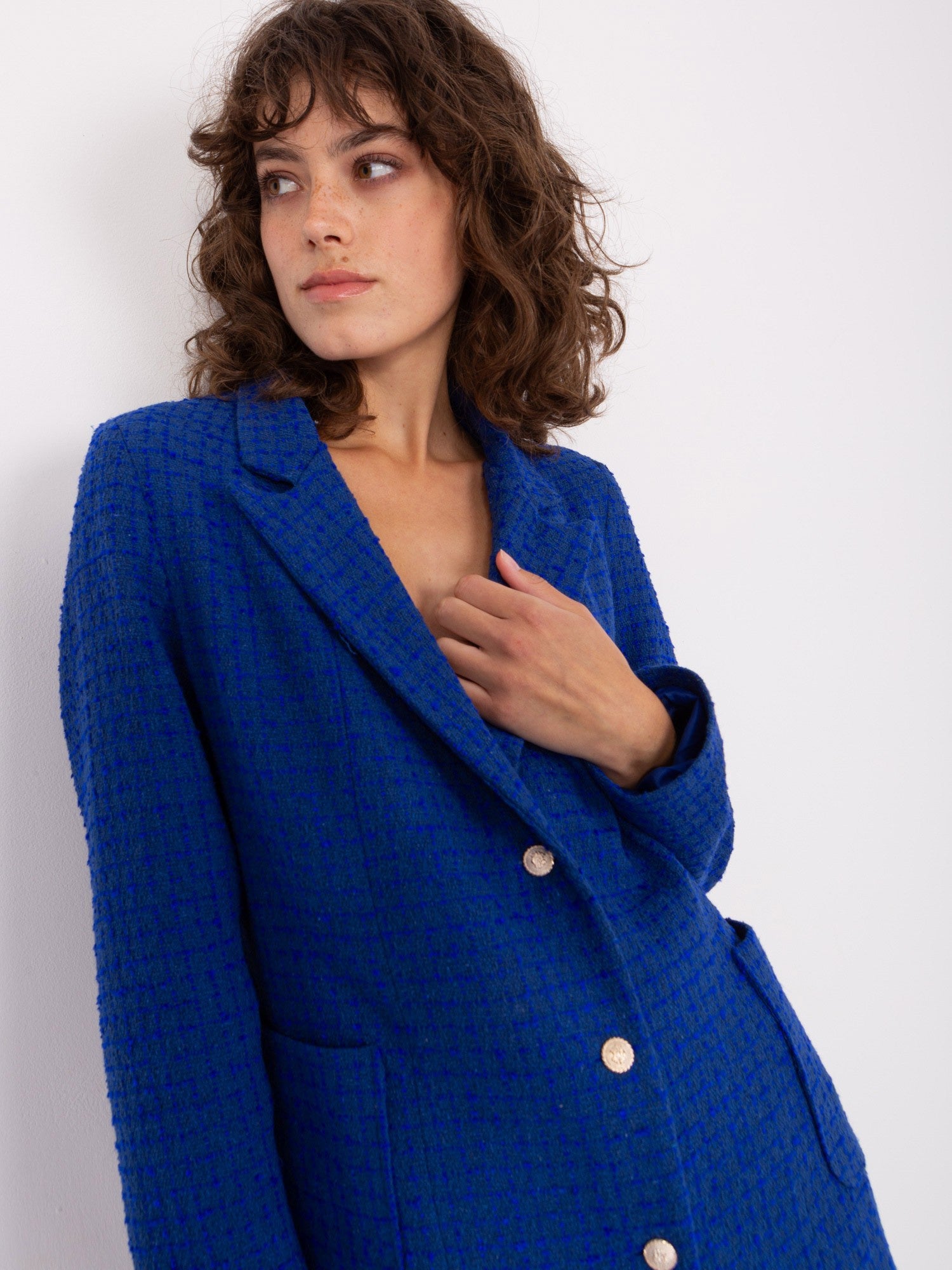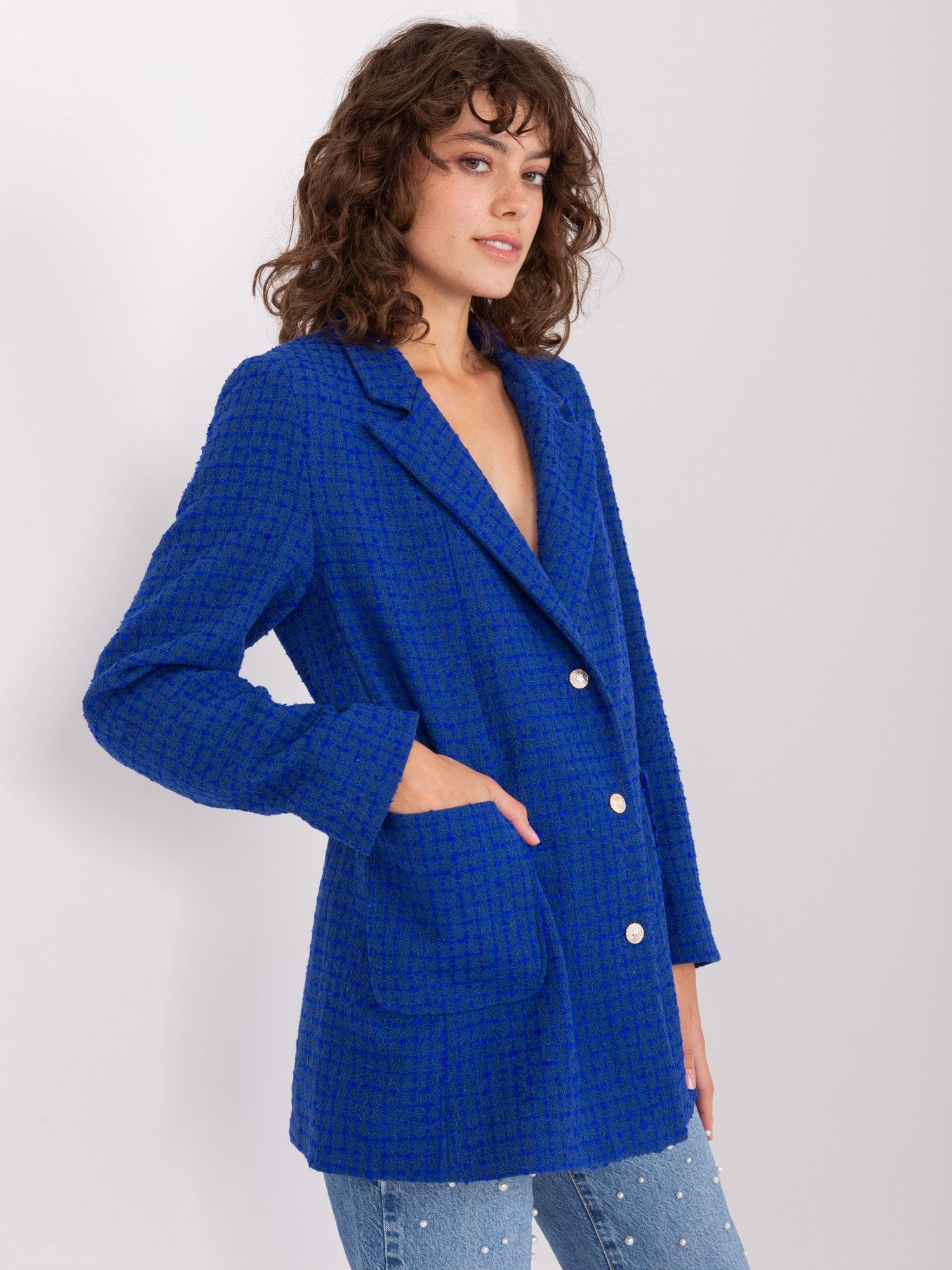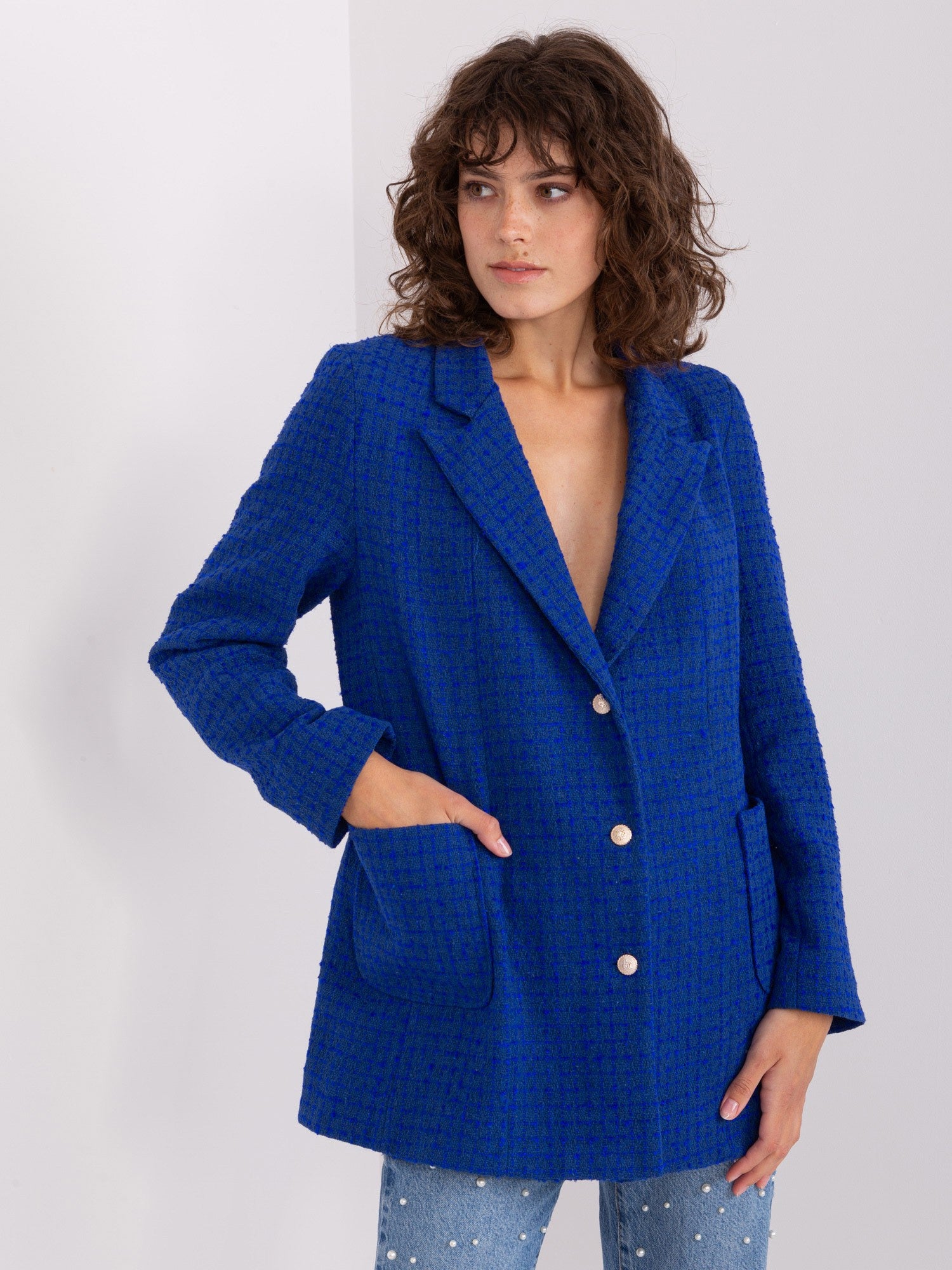 Kobaltowa damska marynarka z kieszeniami .