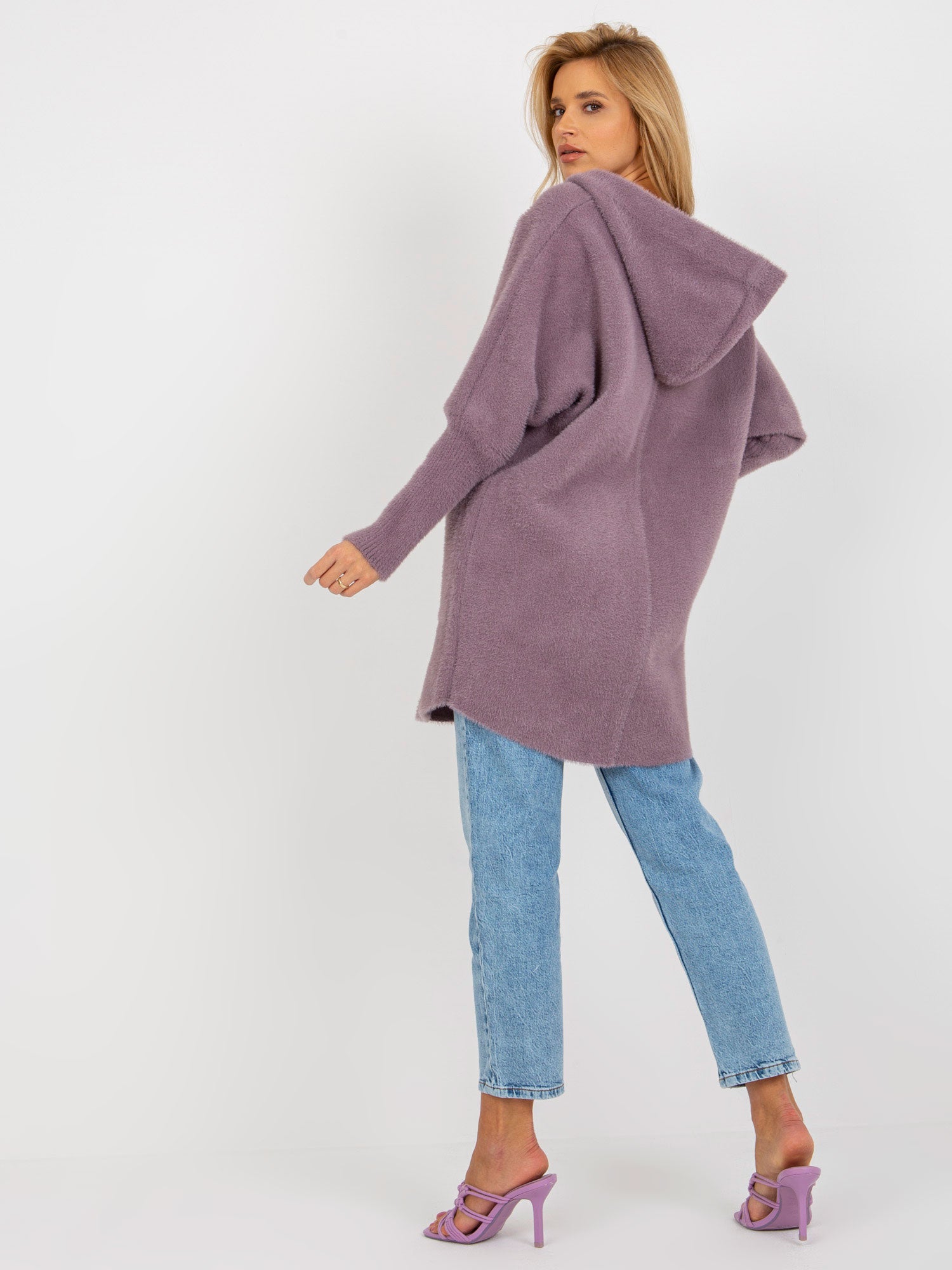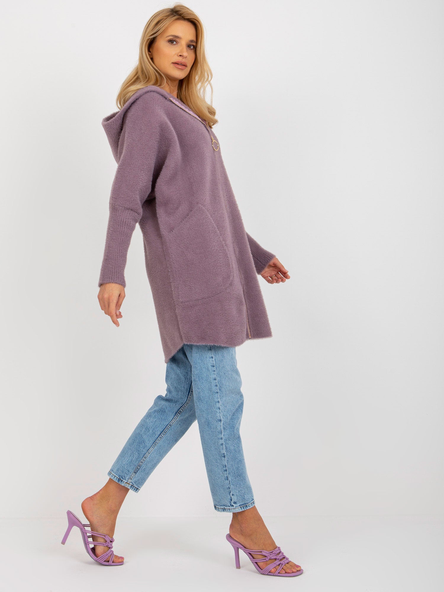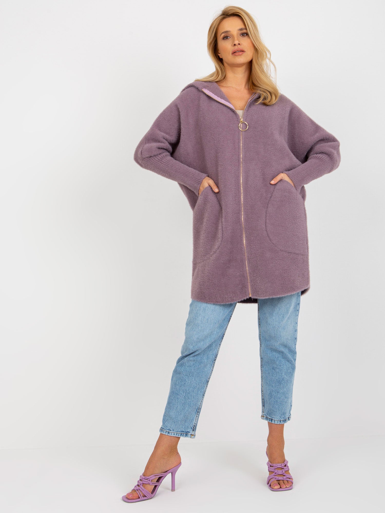 Fioletowy damski płaszcz alpaka z kieszeniami .