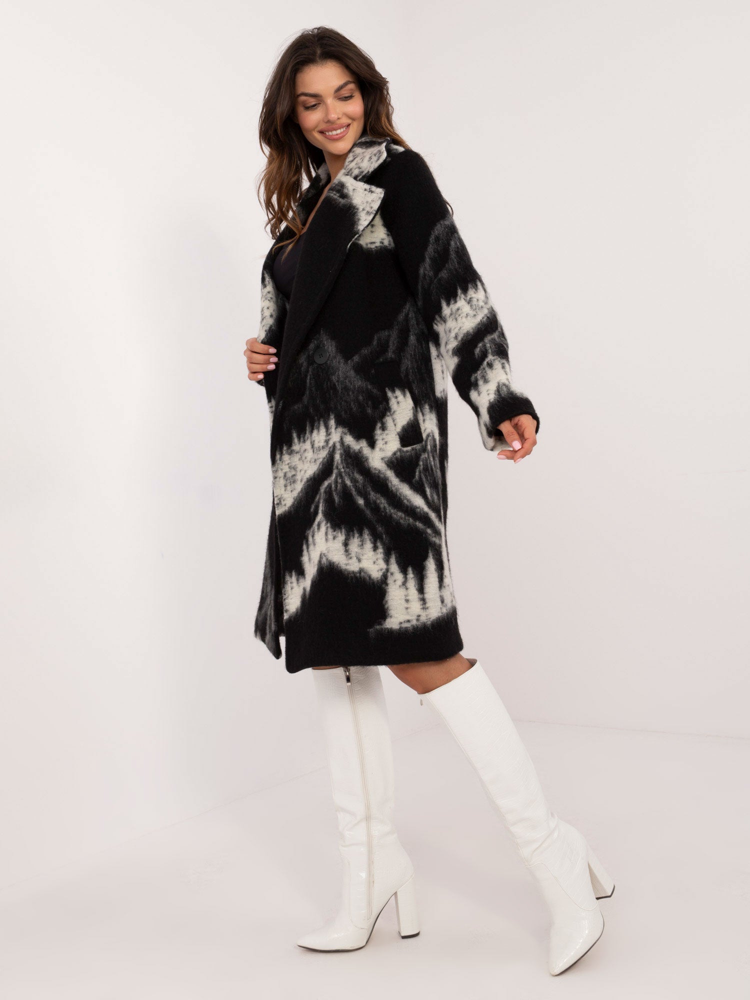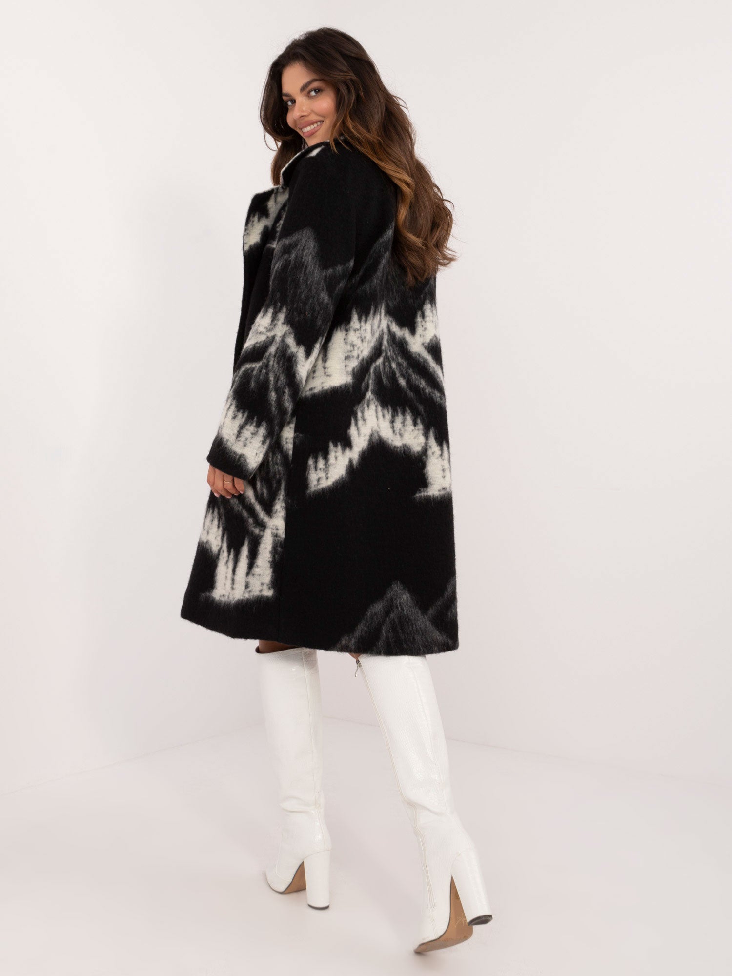 Wymiary płaszcza w rozmiarze one size mierzone na płasko: szerokość pod pachami - 52 cm, długość rękawa - 62 cm, długość całkowita - 101 cm.