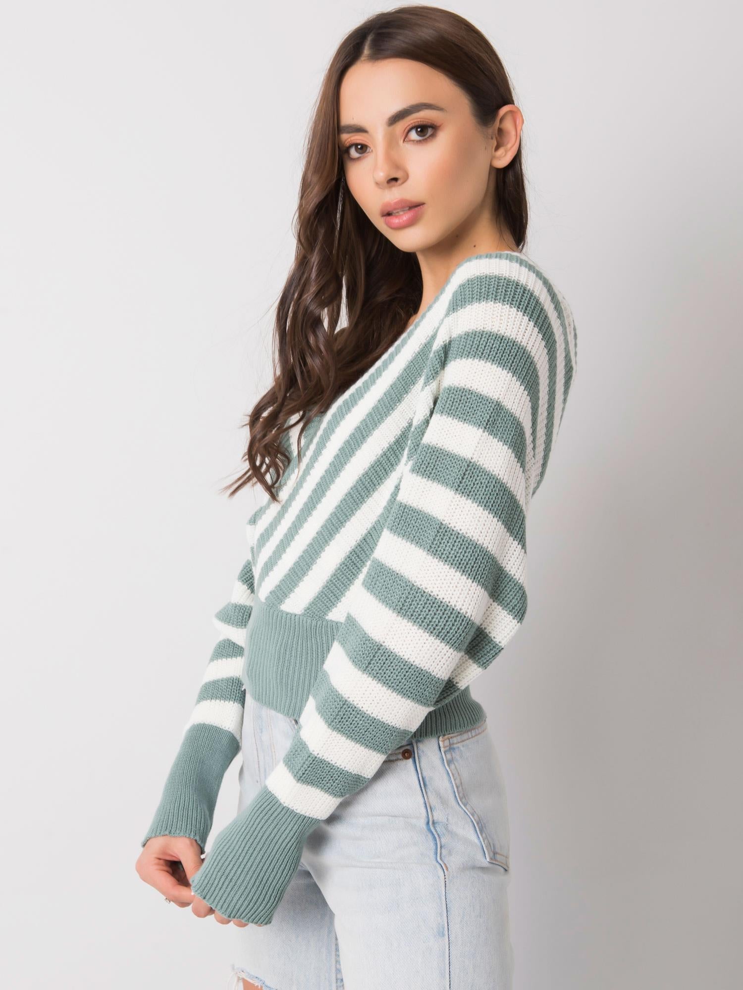 RUE PARIS Miętowo-biały sweter damski z trójkątnym dekoltem.