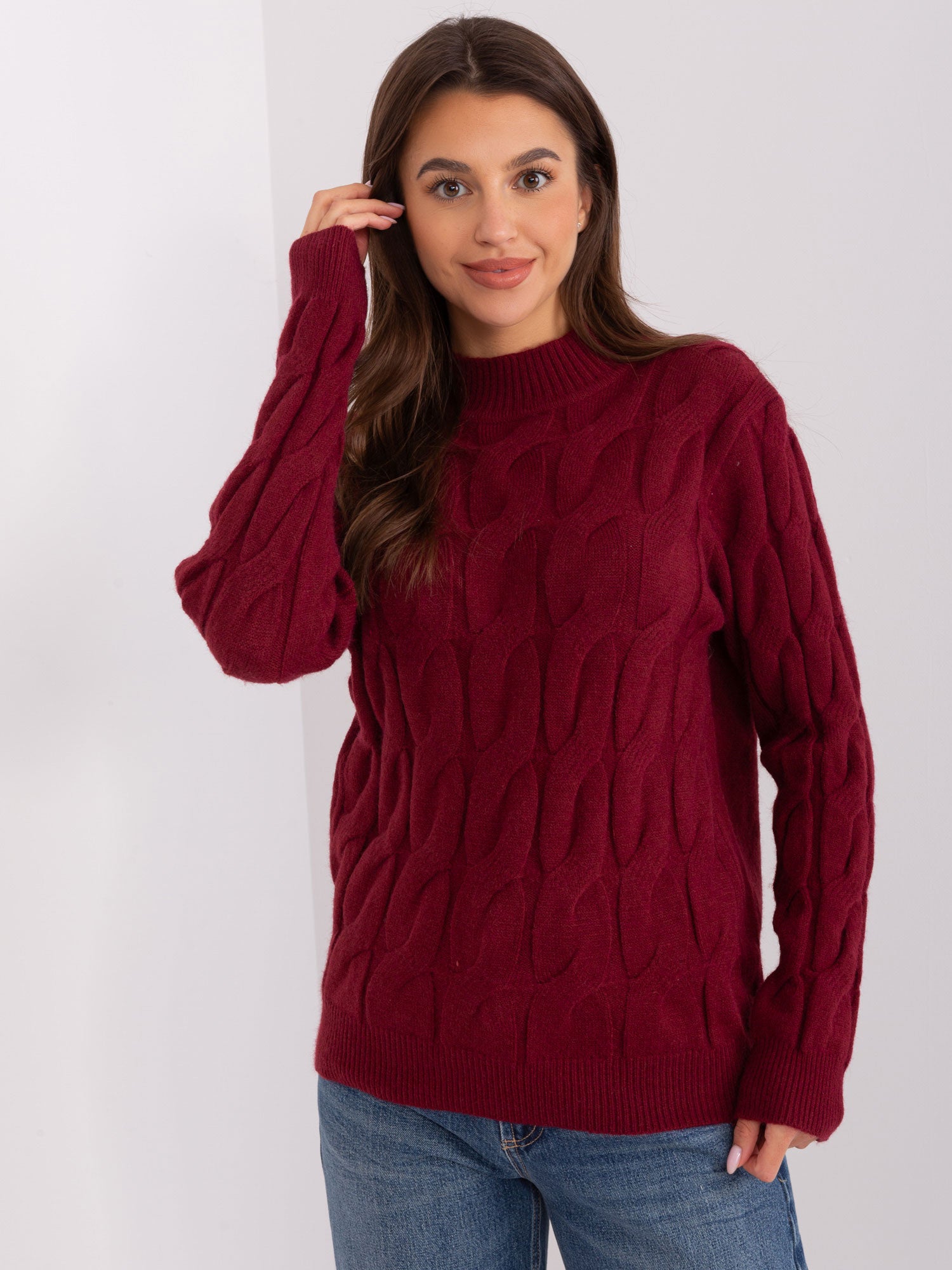 Bordowy dzianinowy sweter w warkocze .