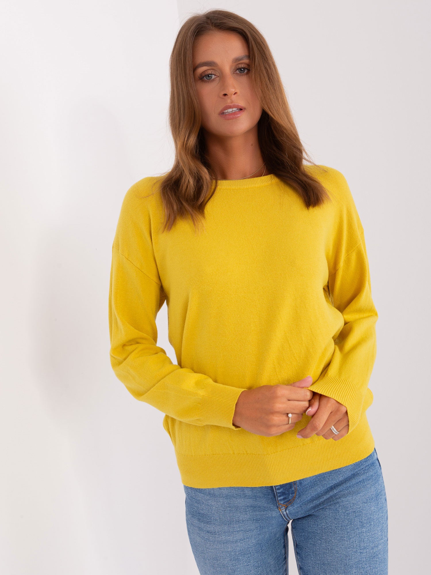 Żółty sweter klasyczny z długim rękawem .