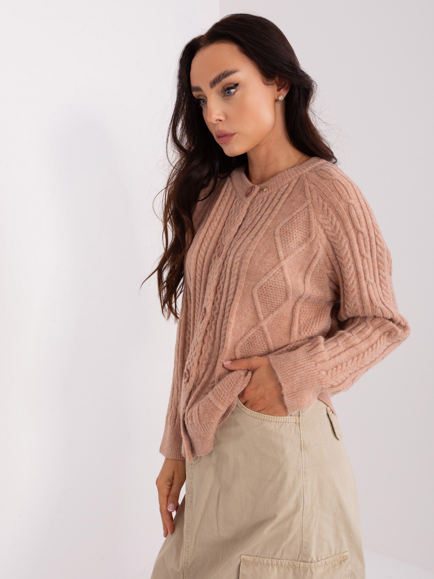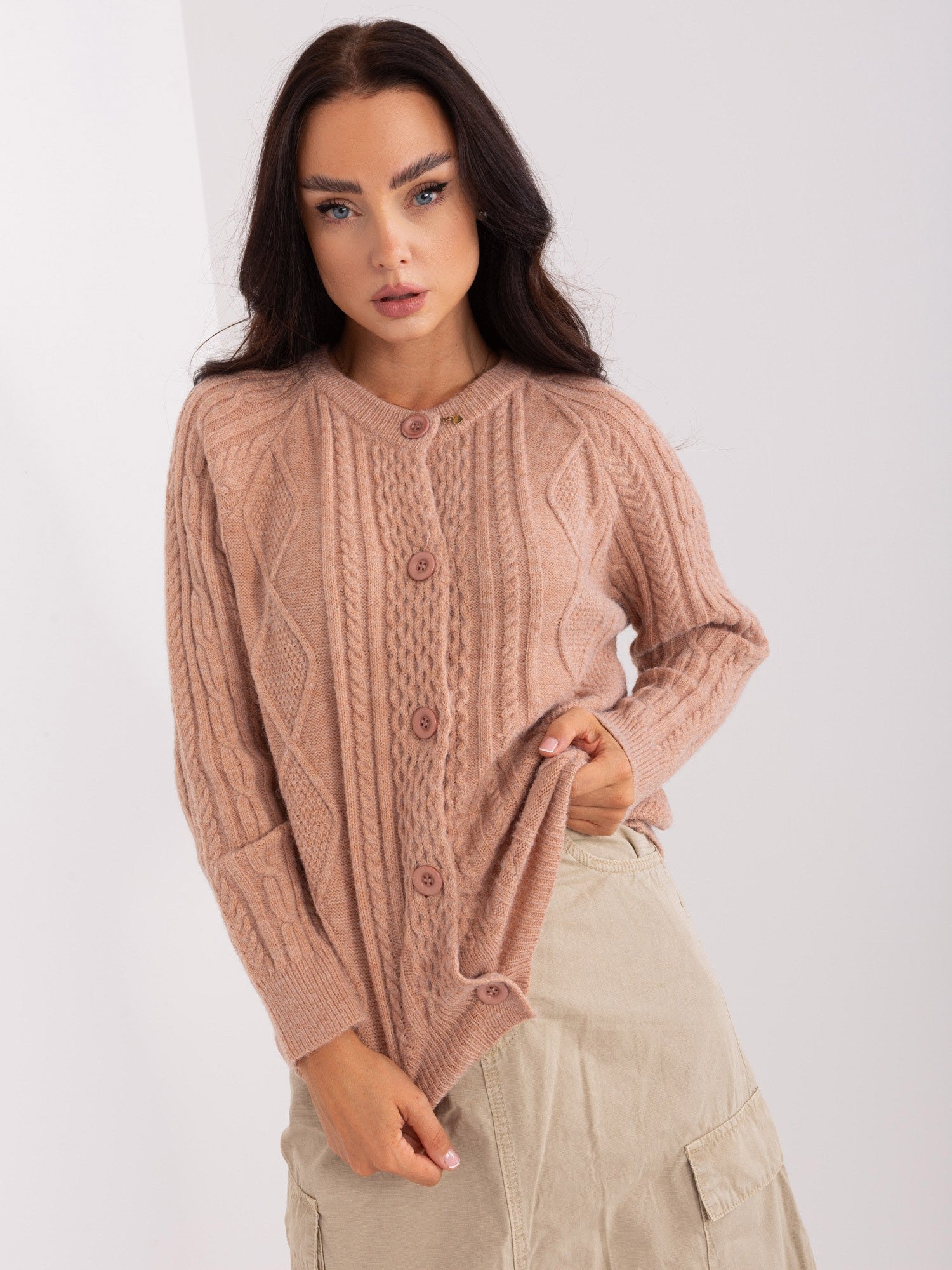Ciemnobeżowy sweter damski rozpinany w warkocze .