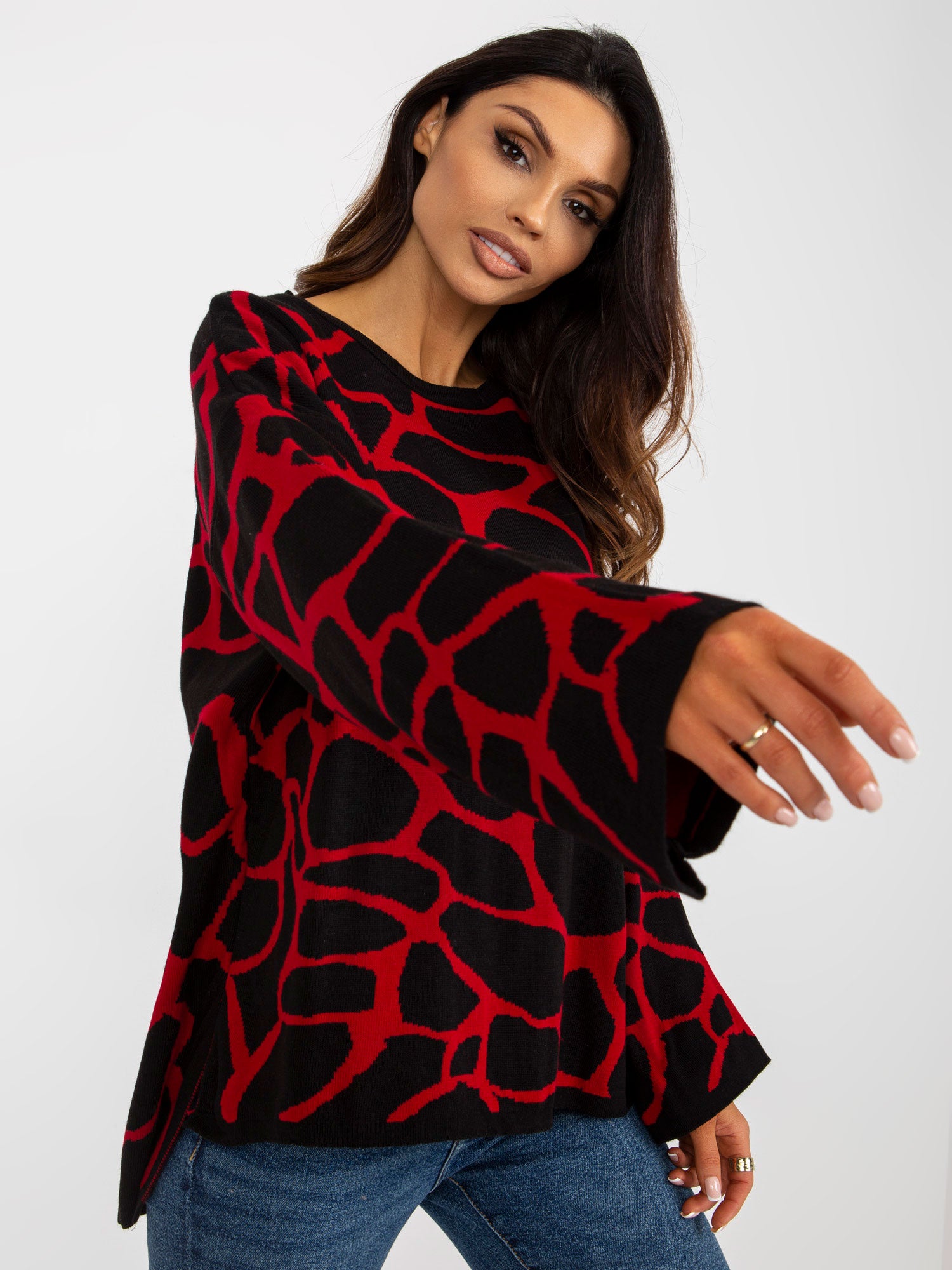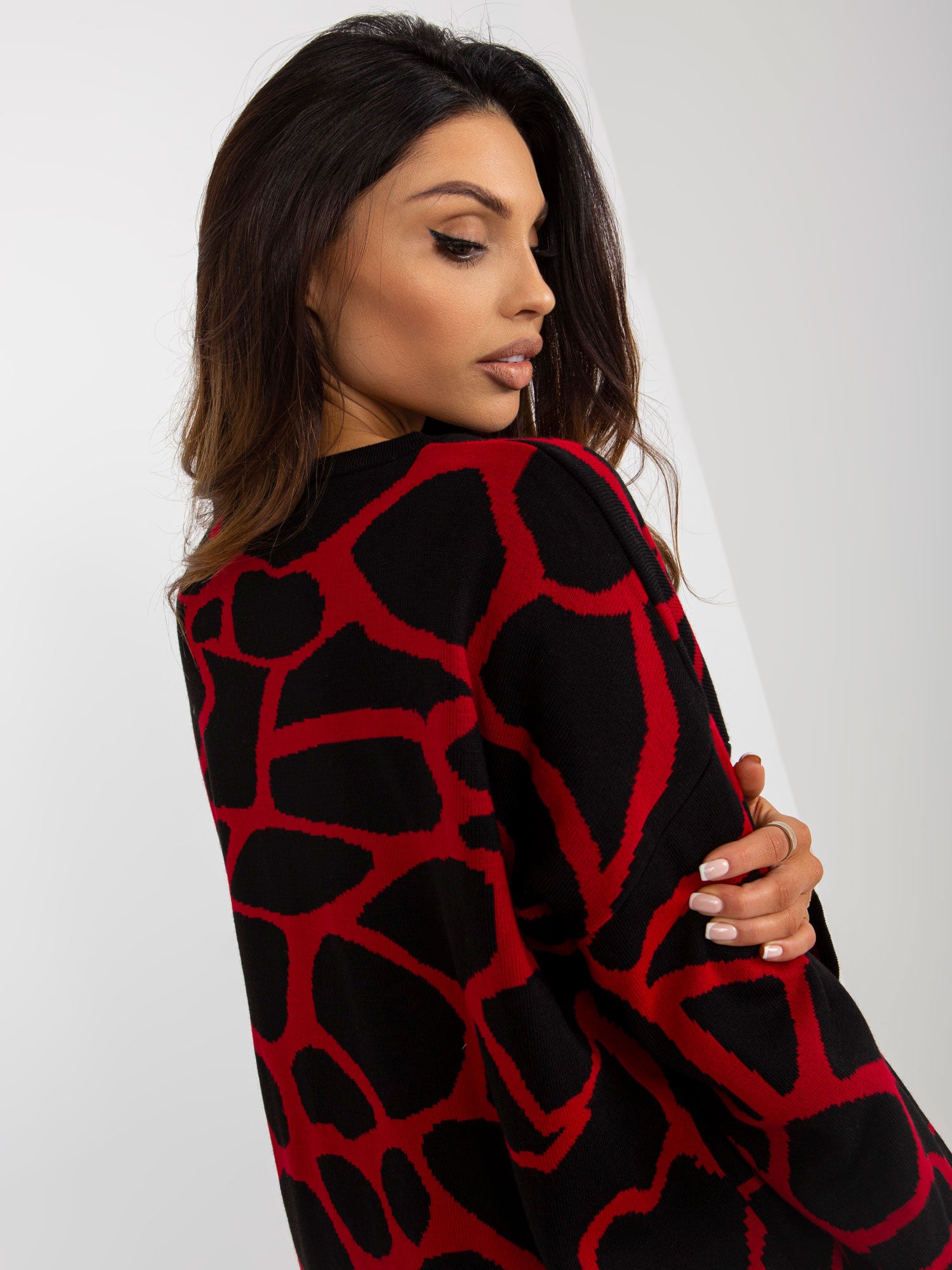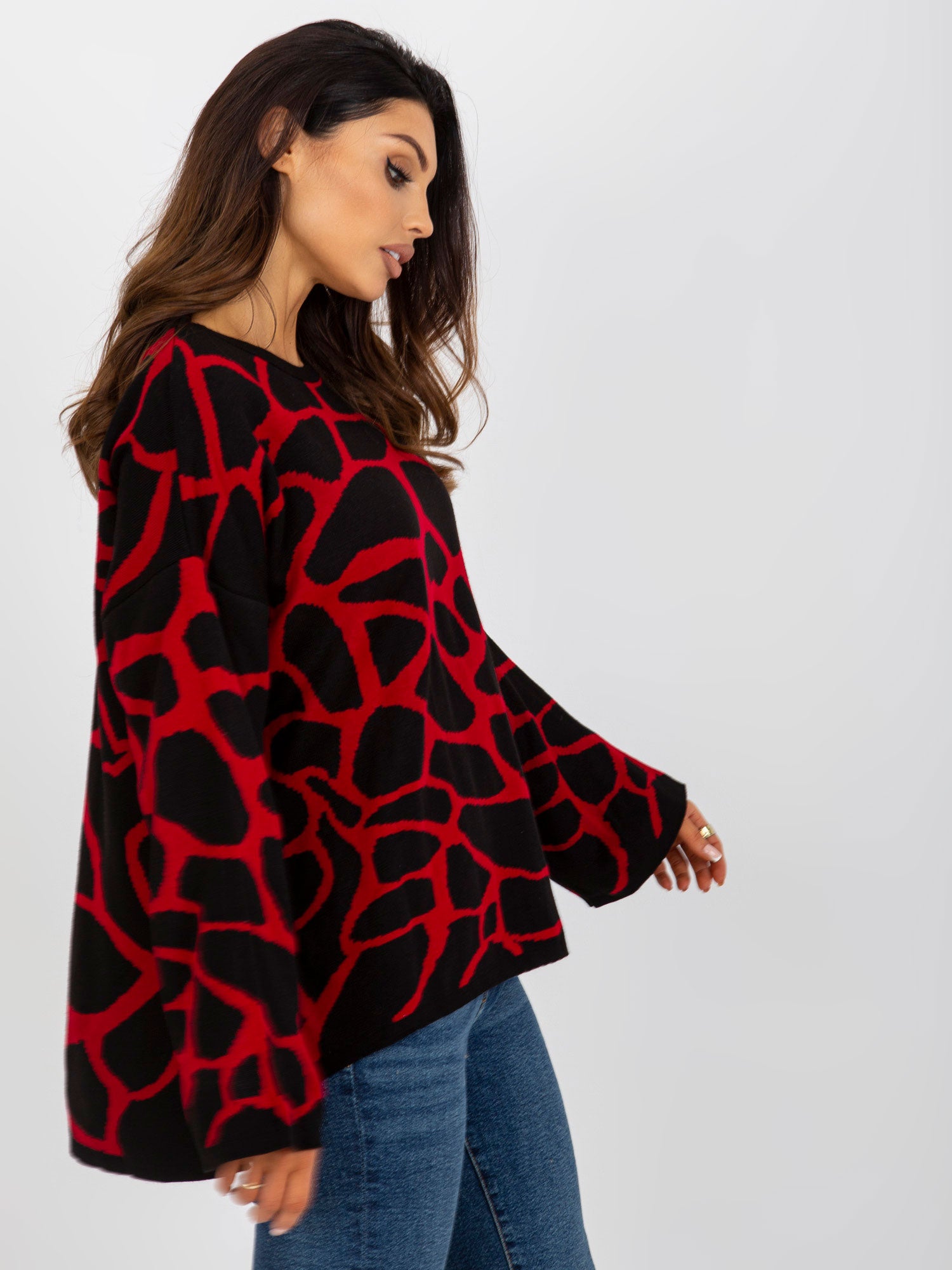 Czerwono-czarny wzorzysty sweter oversize z szerokim rękawem .