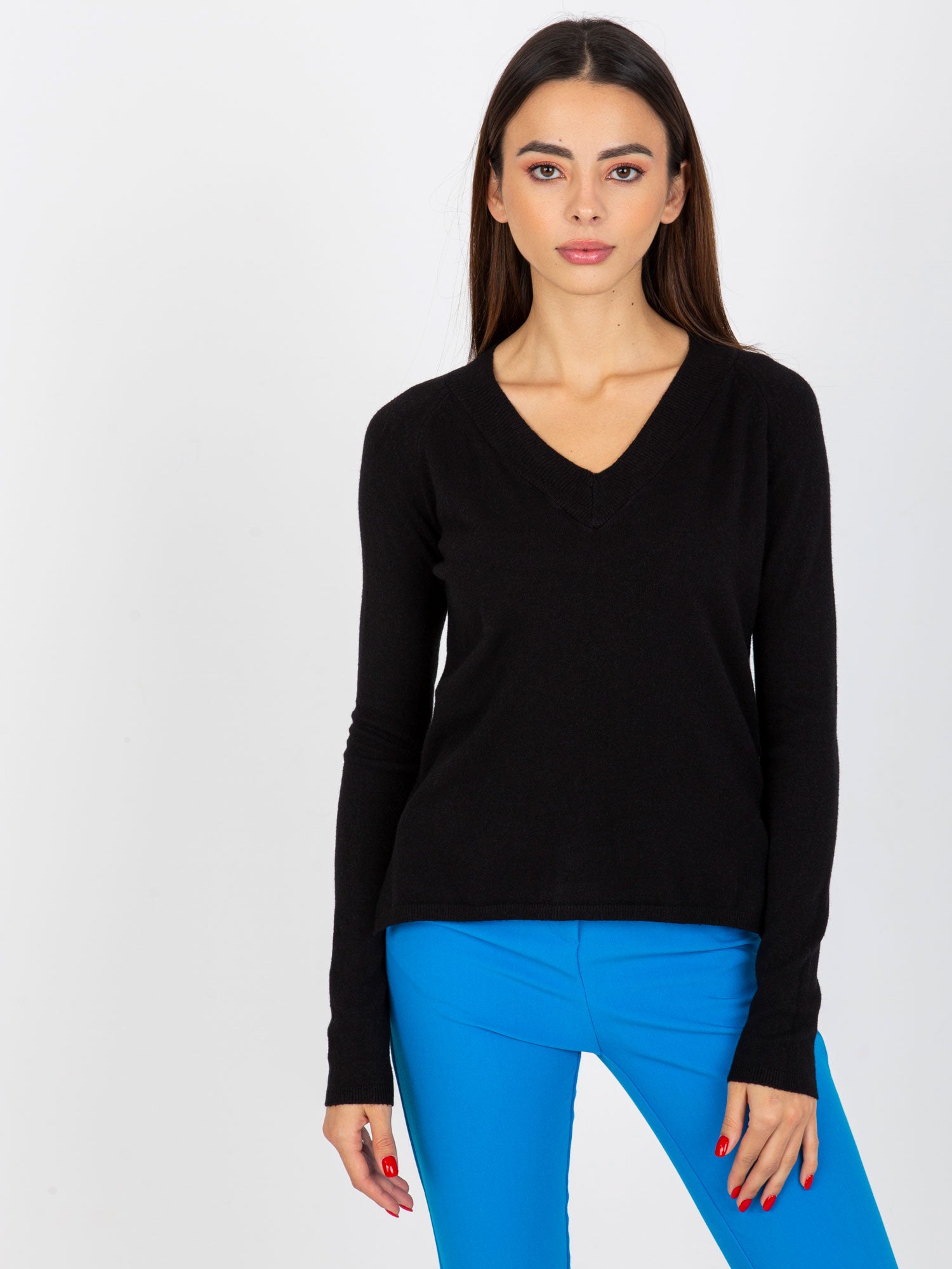 Czarny gładki sweter klasyczny z dekoltem V .