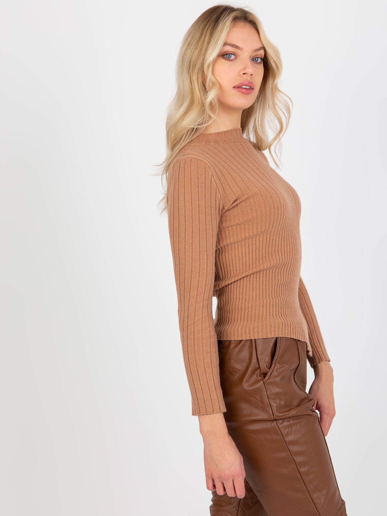 Camelowy dopasowany sweter asymetryczny w prążek .