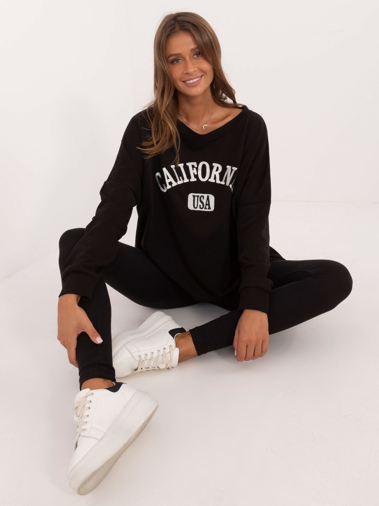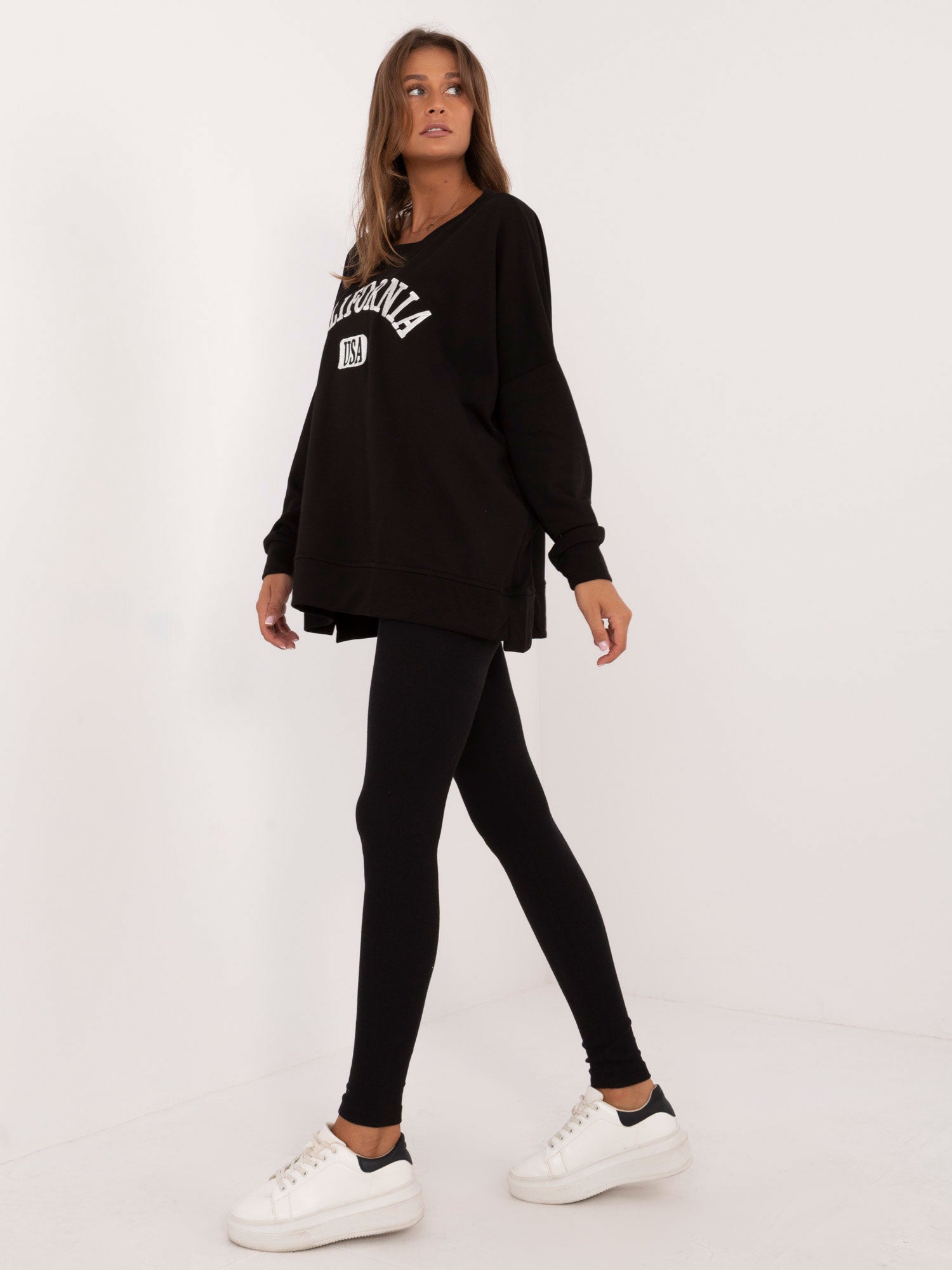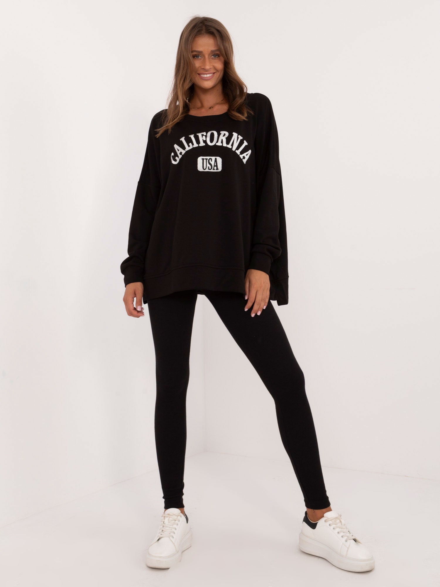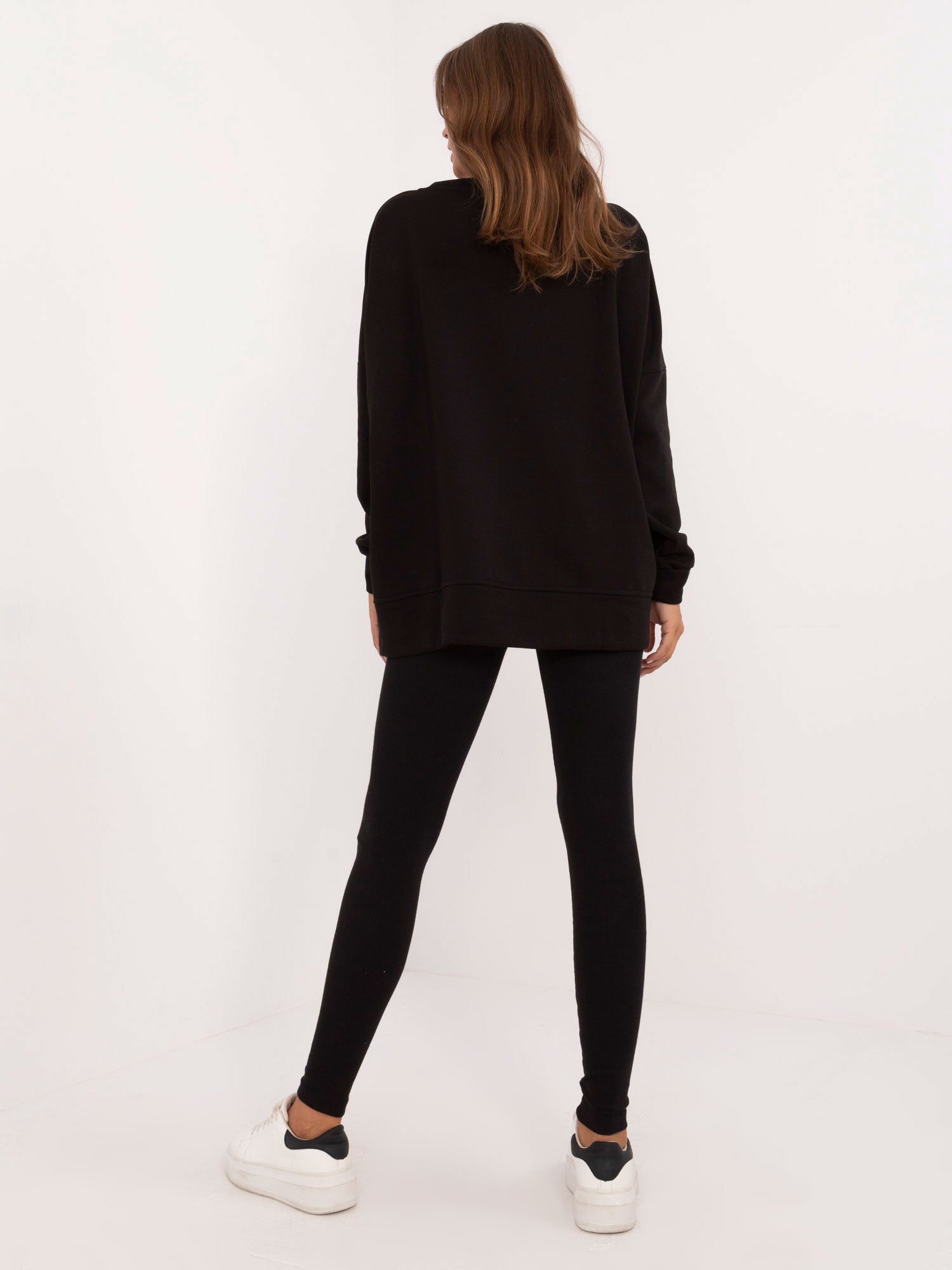 Wymiary kompletu w rozmiarze one size mierzone na płasko: szerokość bluzy pod pachami - 78 cm, długość rękawa - 61 cm, długość bluzy - 70 cm, szerokość legginsów w pasie - 30 cm, wysokość stanu - 31 cm, długość legginsów - 99 cm.